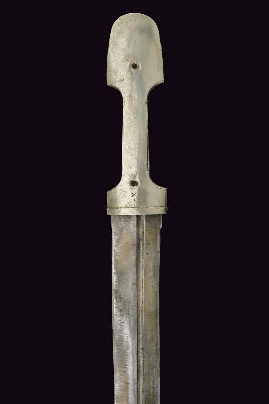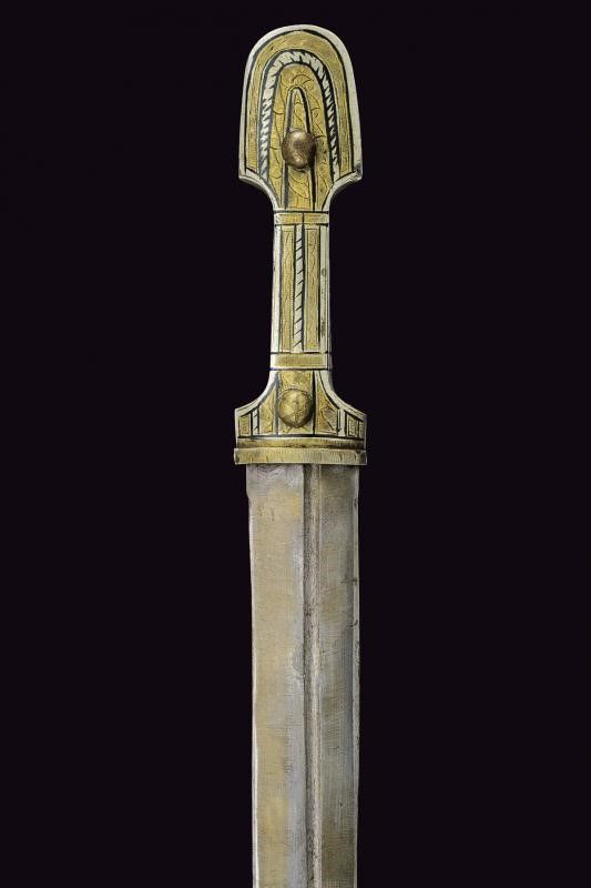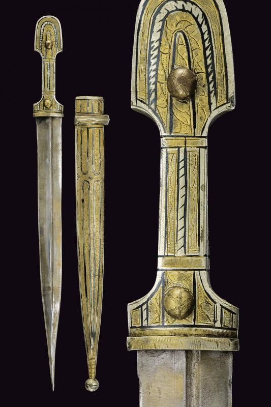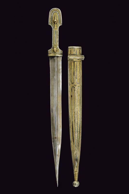 Caucaso, lunghezza 44 cm. 1900 circa Lama dritta a due fili con scanalatura asimmetrica. Impugnatura e fodero in legno rivestiti con lamina in metallo bianco decorato motivi floreali e geometrici in parte dorati e niellati. Questo lotto è importato da un Paese extra UE e comporta una tassazione aggiuntiva rispetto alla commissione della casa d'aste e alla tassa sul servizio. Di conseguenza, la commissione totale, comprensiva di tutte le tasse, ammonta al 35%.