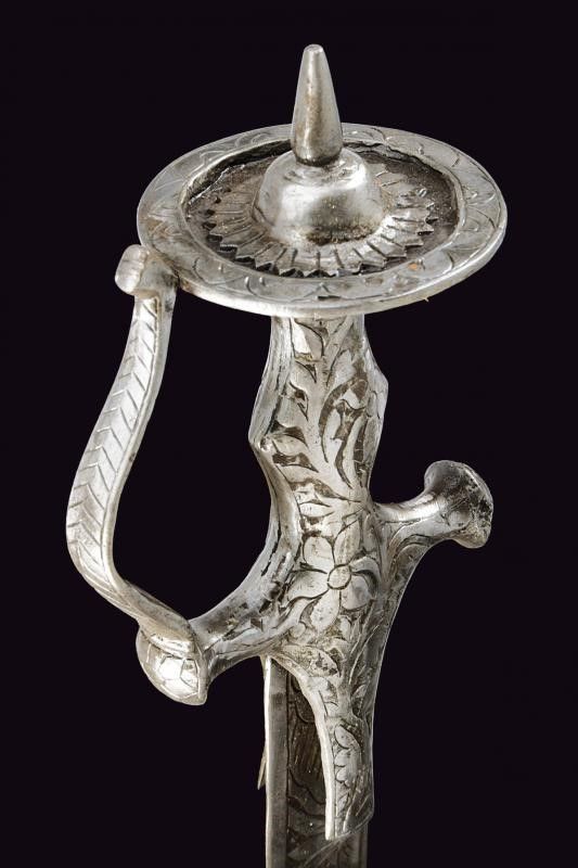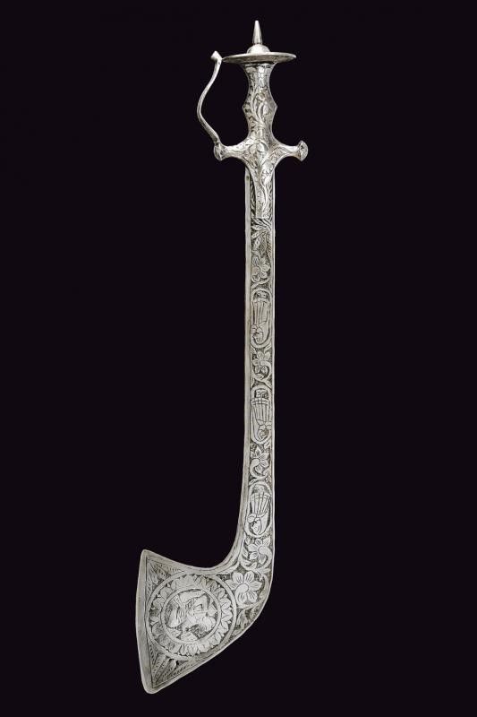India, lunghezza 72 cm. inizio del XX Sec. Larga e robusta lama curva con punta fortemente allargata, a un filo, tutta la superficie decorata con incisioni a figure e motivi floreali. Impugnatura da tulvar in ferro inciso a motivi floreali, guardia. Questo lotto è importato da un Paese extra UE e comporta una tassazione aggiuntiva rispetto alla commissione della casa d'aste e alla tassa sul servizio. Di conseguenza, la commissione totale, comprensiva di tutte le tasse, ammonta al 35%.