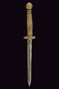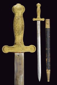 Europa, lunghezza 25.2 cm. Lama dritta a due fili con scanalatura recante iscrizioni illeggibili. Fornimento in [..]