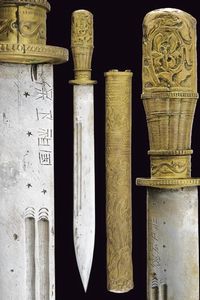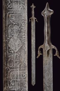 India, lunghezza 85.5 cm. 1900 circa Larga lama dritta a due fili completamente incisa con figure e iscrizioni. [..]