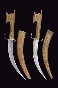 Marocco, lunghezza 36 - 36.5 cm. 1910 circa Lama curve a un filo con sobrie incisioni. Impugnature e foderi in [..]