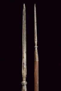 Europa, lunghezza 271.5 cm. Lunghissima cuspide di sezione a losanga con nodo alla base, scure e penna riccamente [..]