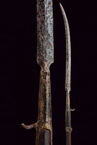 Europa, lunghezza 204 cm. Lunga lama curva a due fili costolata in mezzeria, gorbia con resti di un gancio. Su [..]