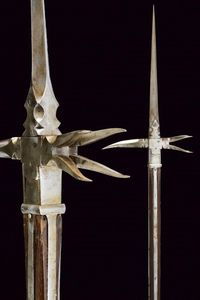 Svizzera, lunghezza 194 cm. Cuspide romboidale, robusta penna ricurva e martello a quattro punte. Bandelle ondulate [..]