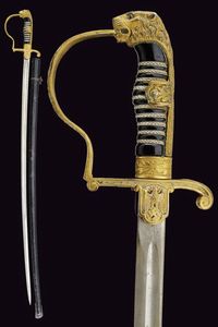 Russia imperiale, lunghezza 88.5 cm. Lama leggermente curva a un filo e controfilo con ampio sguscio. Tallone [..]
