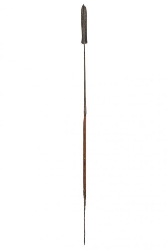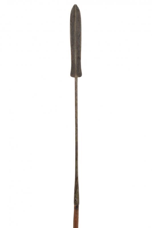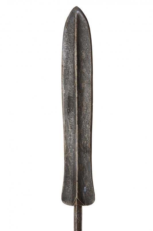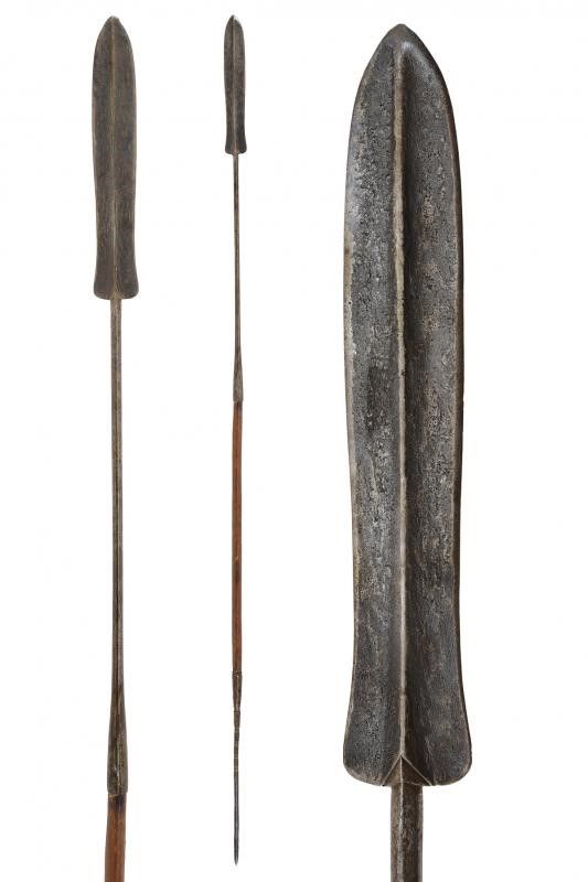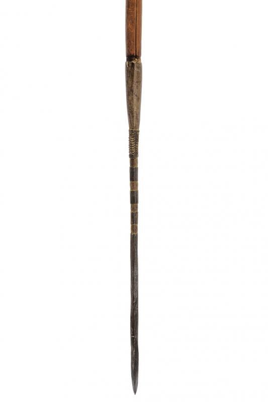 Congo, lunghezza 179 cm. Fine del XIX Secolo Cuspide a due fili con nervatura centrale. Lunga gorbia cilindrica, la parte centrale in legno, la base con fornimenti in ferro. Questo lotto è importato da un Paese extra UE e comporta una tassazione aggiuntiva rispetto alla commissione della casa d'aste e alla tassa sul servizio. Di conseguenza, la commissione totale, comprensiva di tutte le tasse, ammonta al 35%.