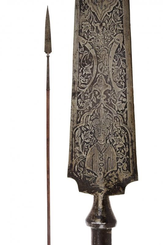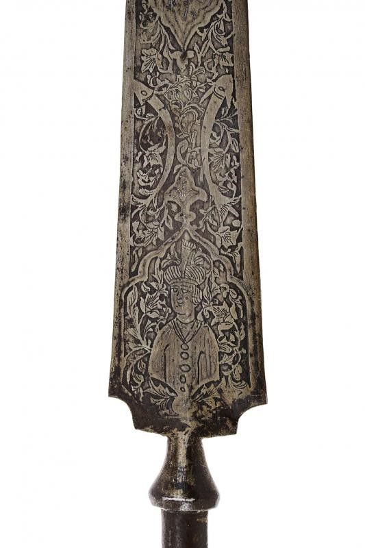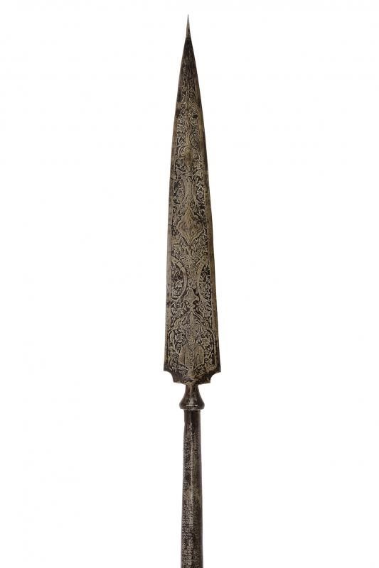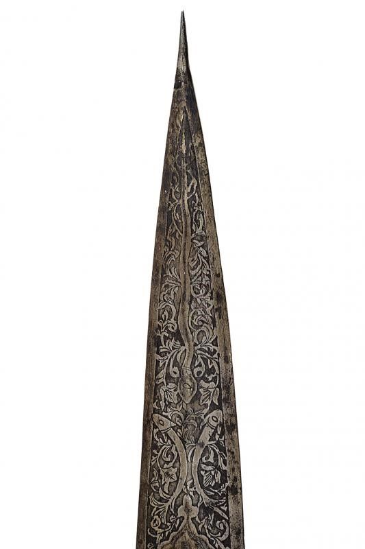 India, lunghezza 208 cm. Fine del XIX Secolo Lama triangolare a due fili, completamente incisa con busto, pesci speculari e motivi floreali. Su nodo. Lunga gorbia troncoconica. Affusto moderno in legno di forma cilindrica. Questo lotto è importato da un Paese extra UE e comporta una tassazione aggiuntiva rispetto alla commissione della casa d'aste e alla tassa sul servizio. Di conseguenza, la commissione totale, comprensiva di tutte le tasse, ammonta al 35%.