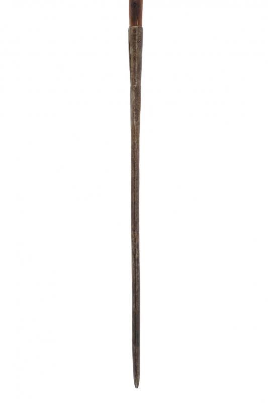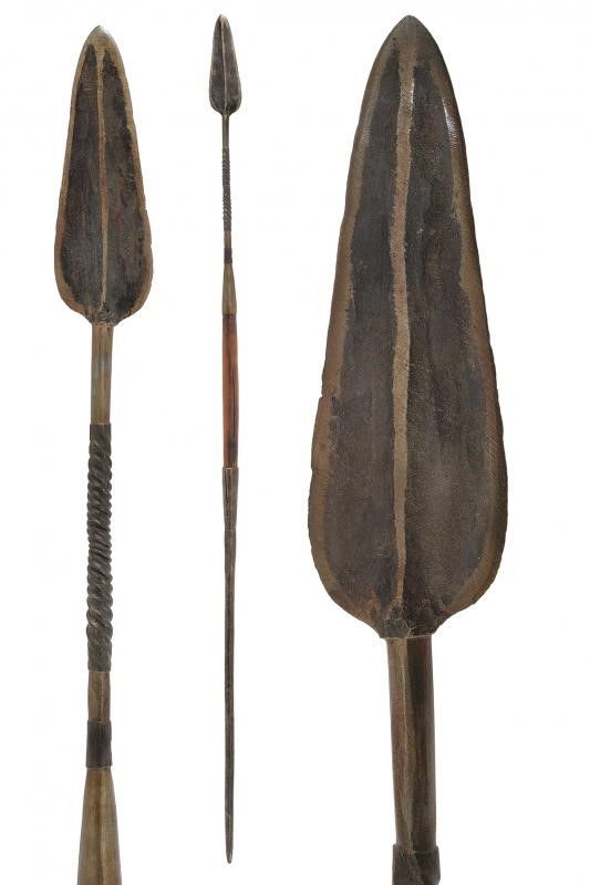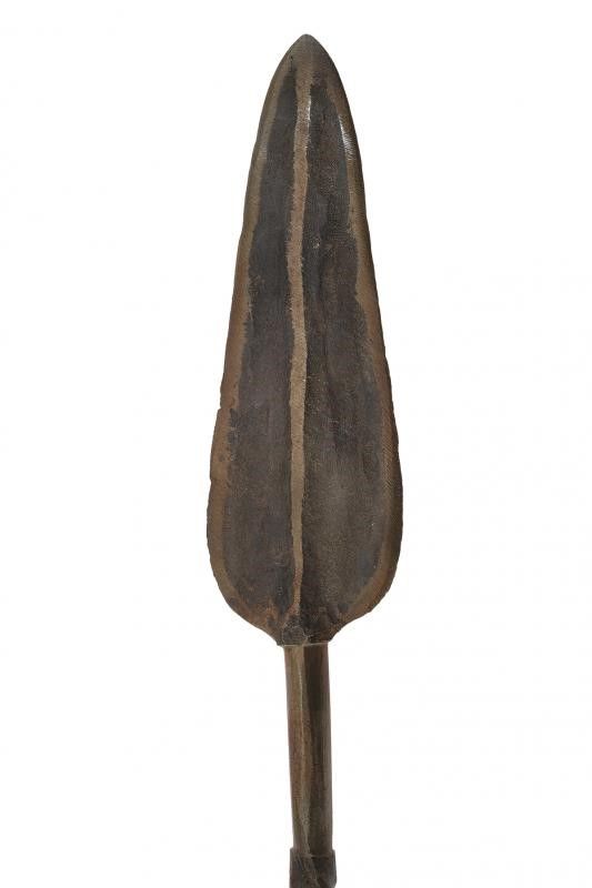 Congo, lunghezza 119.5 cm. Fine del XIX Secolo Piccola cuspide a foglia con nervatura centrale; la base lavorata a spire, gorbia troncoconica. La parte centrale in legno, lunga base in ferro. Questo lotto è importato da un Paese extra UE e comporta una tassazione aggiuntiva rispetto alla commissione della casa d'aste e alla tassa sul servizio. Di conseguenza, la commissione totale, comprensiva di tutte le tasse, ammonta al 35%.