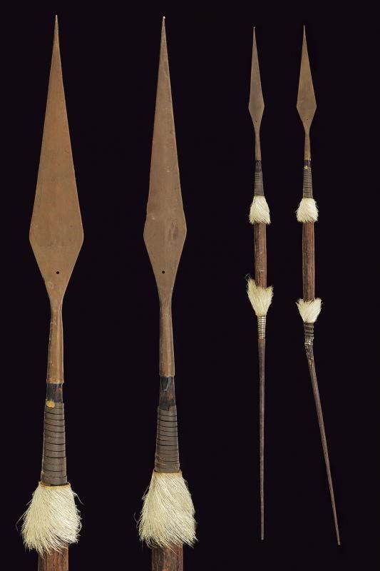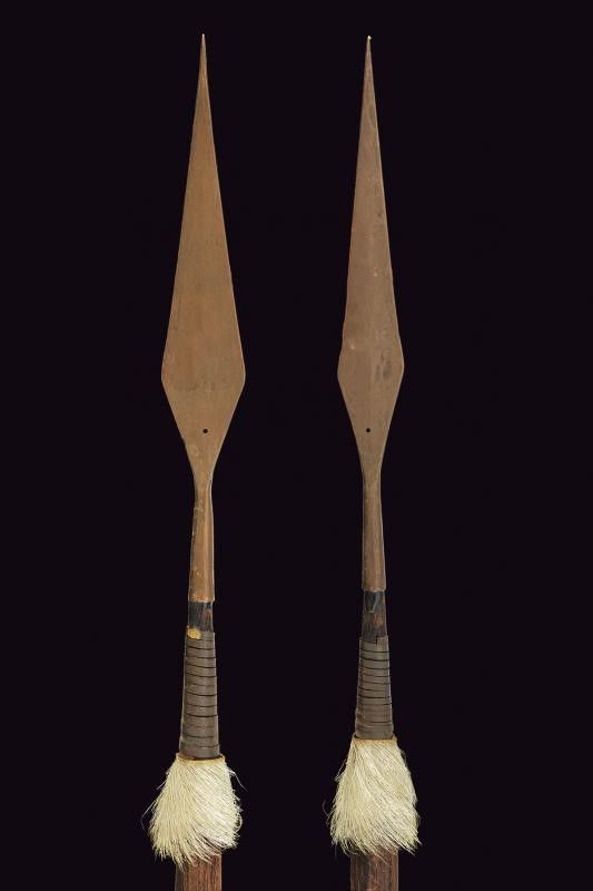 Africa, lunghezza 69.5 - 70.5 cm. 1900 circa Con lame in bronzo, fusti in legno decorati con peli di cinghiale, le basi in ferro. Questo lotto è importato da un Paese extra UE e comporta una tassazione aggiuntiva rispetto alla commissione della casa d'aste e alla tassa sul servizio. Di conseguenza, la commissione totale, comprensiva di tutte le tasse, ammonta al 35%.