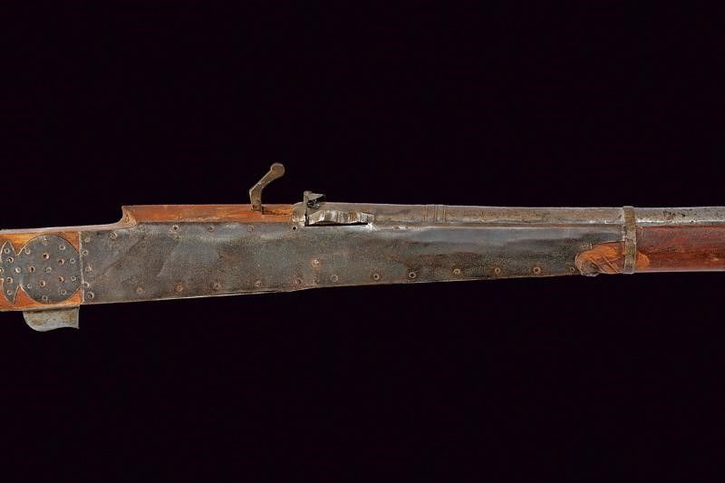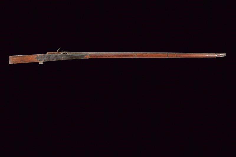 India, lunghezza 238 cm. Prima metà del XIX Secolo Lunghissima canna tonda con alzo e scodellino alla base, nella prima parte varie marcature, la volata leggermente ingrossata ed intagliata. Cassa intera in legno con semplici fornimenti in ferro ed ottone. Bacchetta in ferro. Piccole mancanze e difetti. Questo lotto è importato da un Paese extra UE e comporta una tassazione aggiuntiva rispetto alla commissione della casa d'aste e alla tassa sul servizio. Di conseguenza, la commissione totale, comprensiva di tutte le tasse, ammonta al 35%.