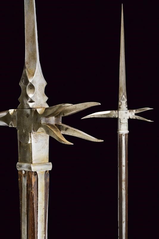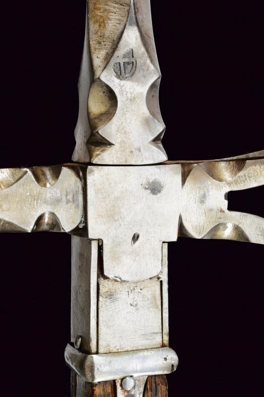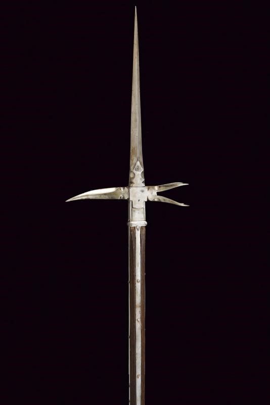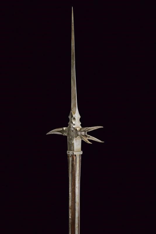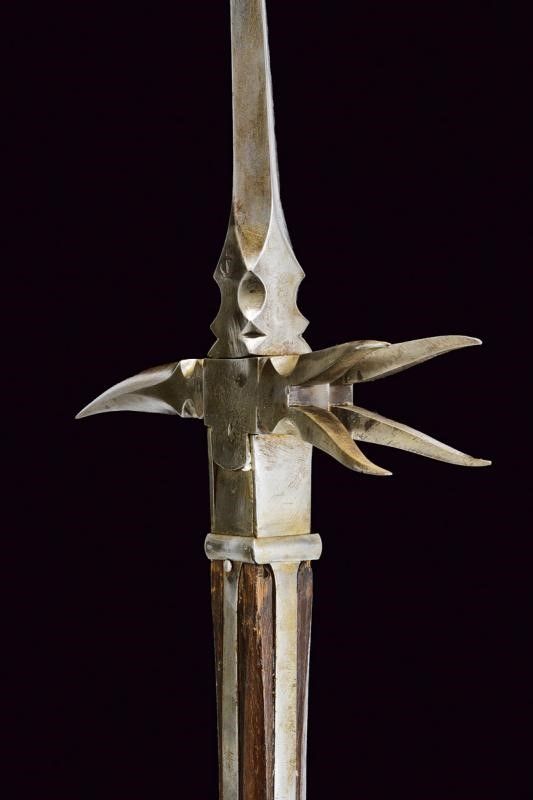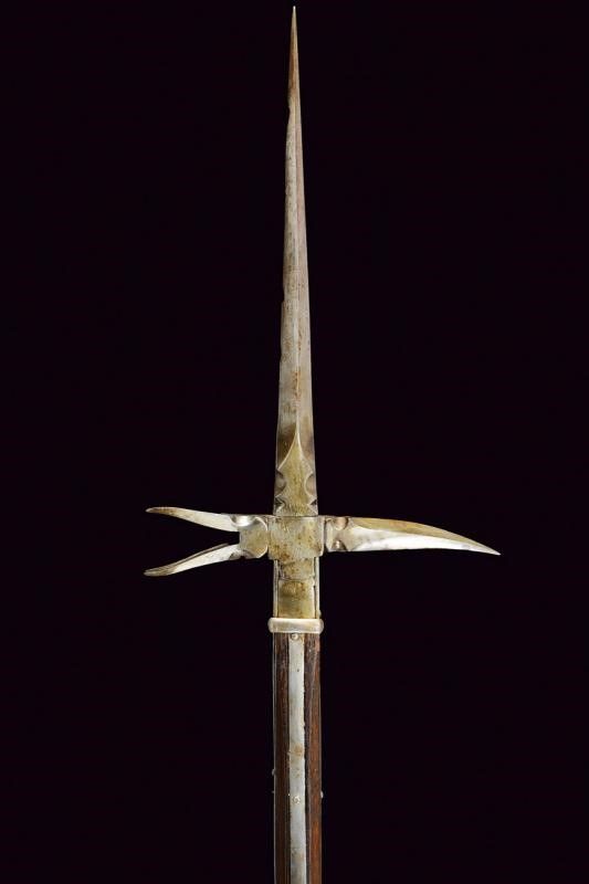 Svizzera, lunghezza 194 cm. Cuspide romboidale, robusta penna ricurva e martello a quattro punte. Bandelle ondulate lunghe su affusto ligneo. Questo lotto è importato da un Paese extra UE e comporta una tassazione aggiuntiva rispetto alla commissione della casa d'aste e alla tassa sul servizio. Di conseguenza, la commissione totale, comprensiva di tutte le tasse, ammonta al 35%.