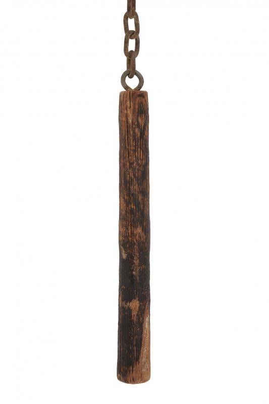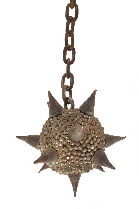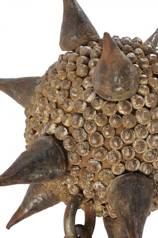 Europa, lunghezza handle 40 cm. Grande testa sferica in legno, munita di dodici robuste cuspidi appuntite in ferro (un'altra mancante), il resto della superficie tempestata con piccole cuspidi in ferro. Fissata con una catena su un fusto ligneo. Questo lotto è importato da un Paese extra UE e comporta una tassazione aggiuntiva rispetto alla commissione della casa d'aste e alla tassa sul servizio. Di conseguenza, la commissione totale, comprensiva di tutte le tasse, ammonta al 35%.