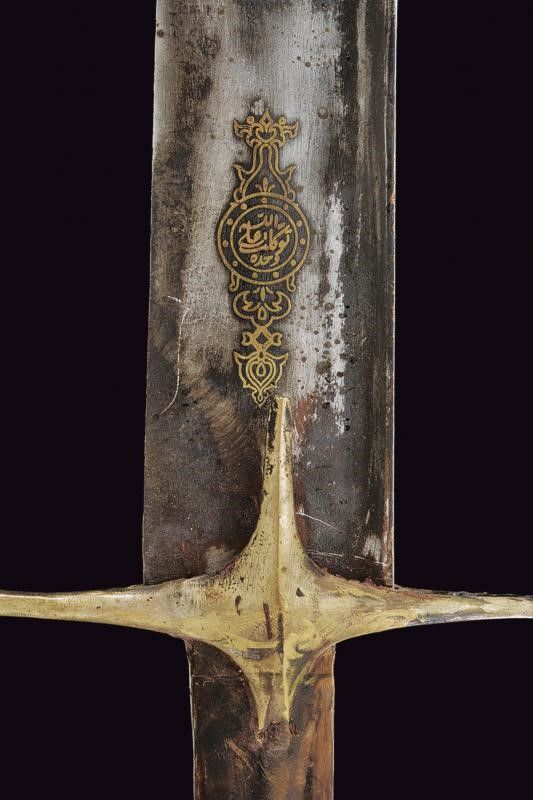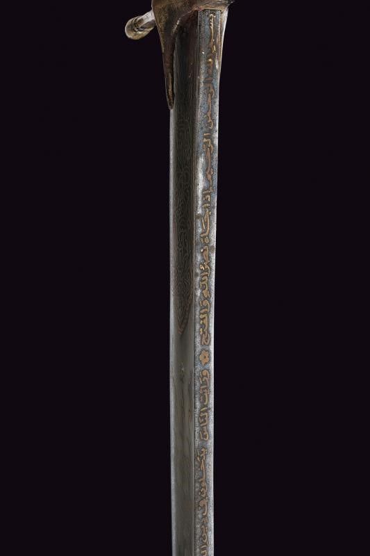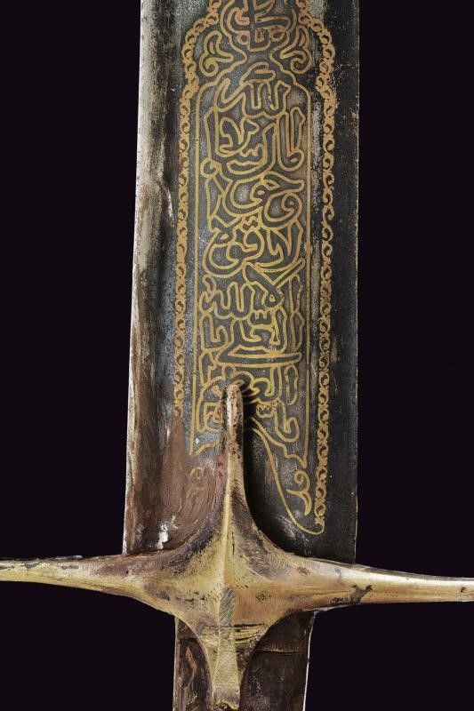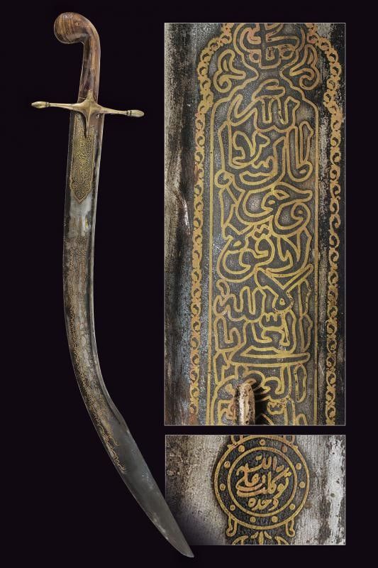 Turchia, lunghezza 87.5 cm. 1900 circa Larga lama curva a un filo e controfilo con dorso a 'T', tutta la superficie e anche il dorso con iscrizioni e decorazioni rimesse in ottone. Elso in ottone a croce, le alette superiori accorciate. Impugnatura con guancette in legno di restauro. Probabilmente una pala per uso cerimoniale. Questo lotto è importato da un Paese extra UE e comporta una tassazione aggiuntiva rispetto alla commissione della casa d'aste e alla tassa sul servizio. Di conseguenza, la commissione totale, comprensiva di tutte le tasse, ammonta al 35%.