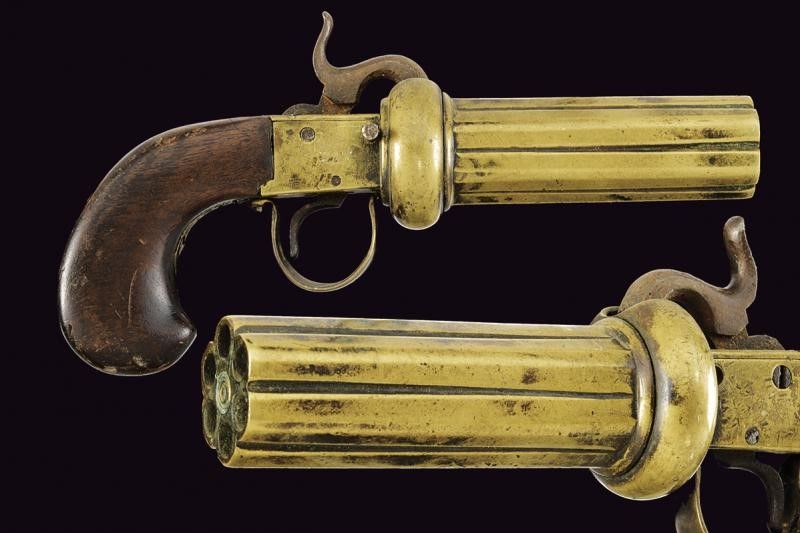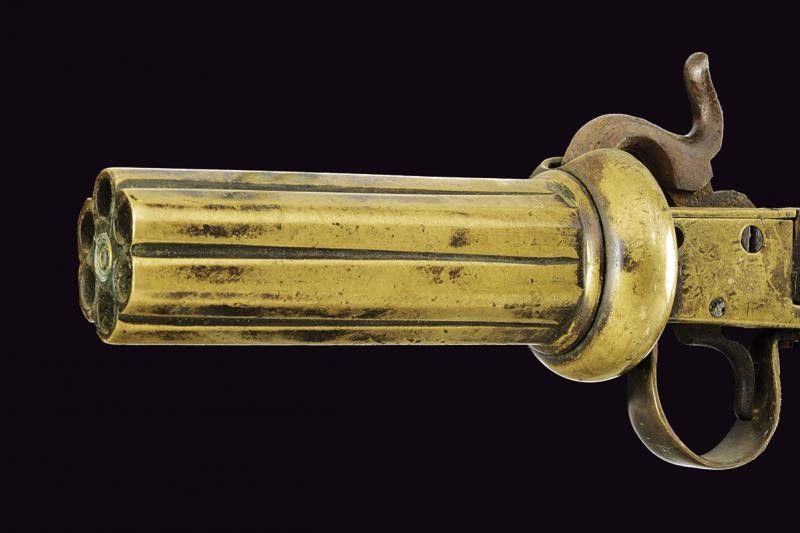 Europa, lunghezza 21.5 cm. 1855 circa Gruppo canne-tamburo in ottone a sei colpi; cal. 7 mm. Castello del tipo box-lock in ottone. Cane e grilletto in ferro. Meccanica da rivedere. Calcio in legno con scudetto ovale in metallo bianco. Questo lotto è importato da un Paese extra UE e comporta una tassazione aggiuntiva rispetto alla commissione della casa d'aste e alla tassa sul servizio. Di conseguenza, la commissione totale, comprensiva di tutte le tasse, ammonta al 35%.