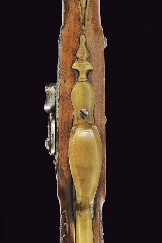 Europa, lunghezza 31 cm. Metà del XIX Secolo Canna rigata ottagonale con mirino in ottone; cal. 13 mm. Codetta con alzo. Batteria a molla in avanti con meccanica funzionate. Cassa in legno con calcio zigrinato e decorato con piccoli chiodi in metallo bianco. Fornimenti in ottone. Muso e battipalla della bacchetta in osso. Stecher. Questo lotto è importato da un Paese extra UE e comporta una tassazione aggiuntiva rispetto alla commissione della casa d'aste e alla tassa sul servizio. Di conseguenza, la commissione totale, comprensiva di tutte le tasse, ammonta al 35%.