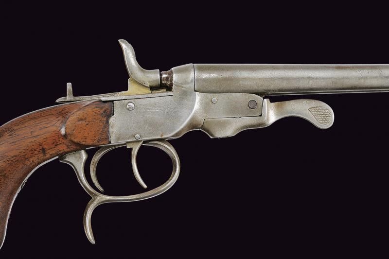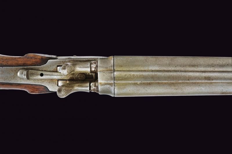 1880 circa Canne di sezione tonde, lisce, giustapposte, basculanti, bindella marcata 'CAL 380', mirino in ottone. Castello liscio. Un cane non tiene la resta. Sicura. Ponticello con poggiadito. Calcio in legno. Questo lotto è importato da un Paese extra UE e comporta una tassazione aggiuntiva rispetto alla commissione della casa d'aste e alla tassa sul servizio. Di conseguenza, la commissione totale, comprensiva di tutte le tasse, ammonta al 35%.