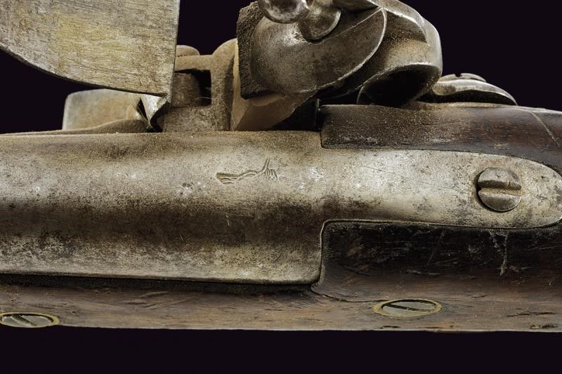 Inghilterra, lunghezza 39.5 cm. Canna liscia, tonda, punzone arabo; cal. 17 mm. Batteria a pietra focaia con punzone arabo. Cassa intera in legno con fornimenti in ottone. Anello di sospensione e bacchetta a snodo in ferro. Questo lotto è importato da un Paese extra UE e comporta una tassazione aggiuntiva rispetto alla commissione della casa d'aste e alla tassa sul servizio. Di conseguenza, la commissione totale, comprensiva di tutte le tasse, ammonta al 35%.