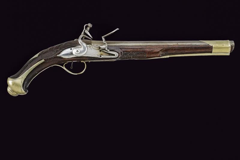Balcani, lunghezza 46.5 cm. Metà del XIX Secolo Canna liscia, tonda con base ottagonale. Batteria a pietra focaia sobriamente incisa. Cassa intera in legno leggermente scolpito e con fornimenti lisci in metallo bianco. Bacchetta finta. Questo lotto è importato da un Paese extra UE e comporta una tassazione aggiuntiva rispetto alla commissione della casa d'aste e alla tassa sul servizio. Di conseguenza, la commissione totale, comprensiva di tutte le tasse, ammonta al 35%.