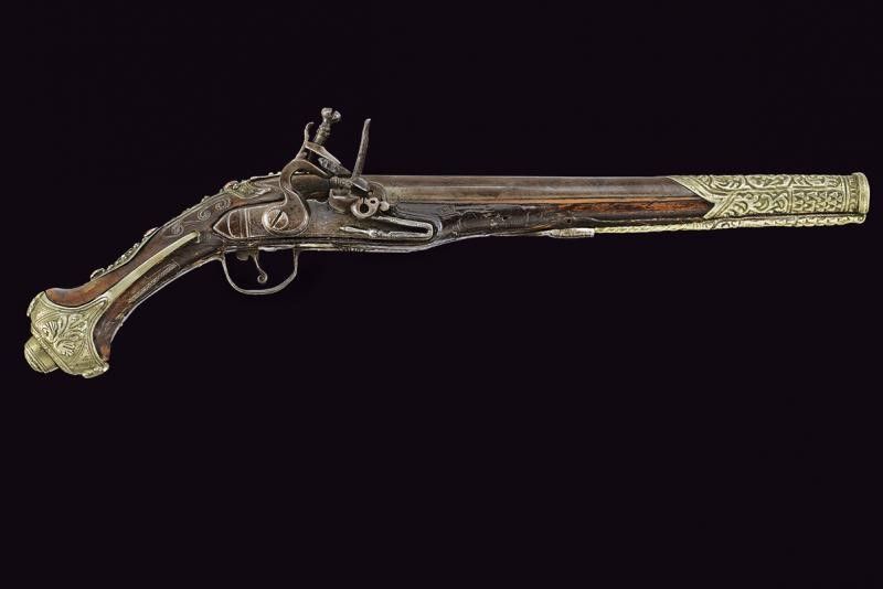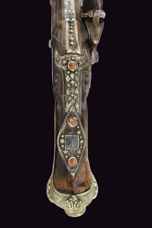 Turchia, lunghezza 47.5 cm. Metà del XIX Secolo Canna liscia, tonda con base ottagonale decorata a simboli e motivi geometrici; cal. 15 mm. Codetta ricoperta in lamina di argento e decorata in filigrana. Batteria a pietra focaia. Cassa intera in legno leggermente scolpito e con decorazioni in filigrana. Fornimenti in argento. Il ponticello e la contropiastra in ferro. Piccoli difetti e mancanze. Questo lotto è importato da un Paese extra UE e comporta una tassazione aggiuntiva rispetto alla commissione della casa d'aste e alla tassa sul servizio. Di conseguenza, la commissione totale, comprensiva di tutte le tasse, ammonta al 35%.