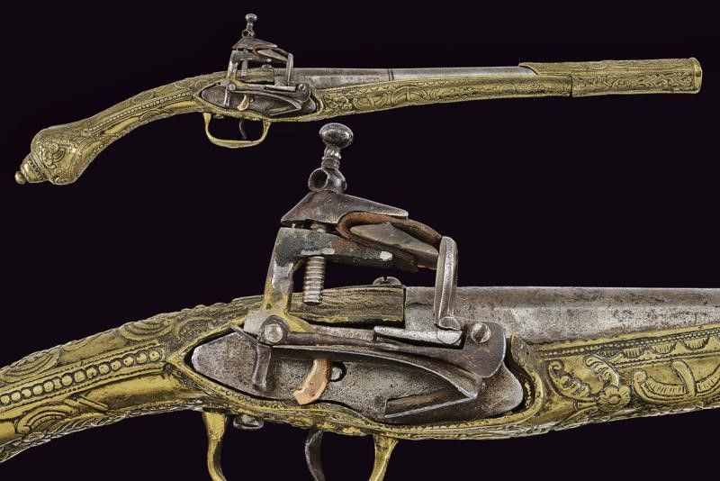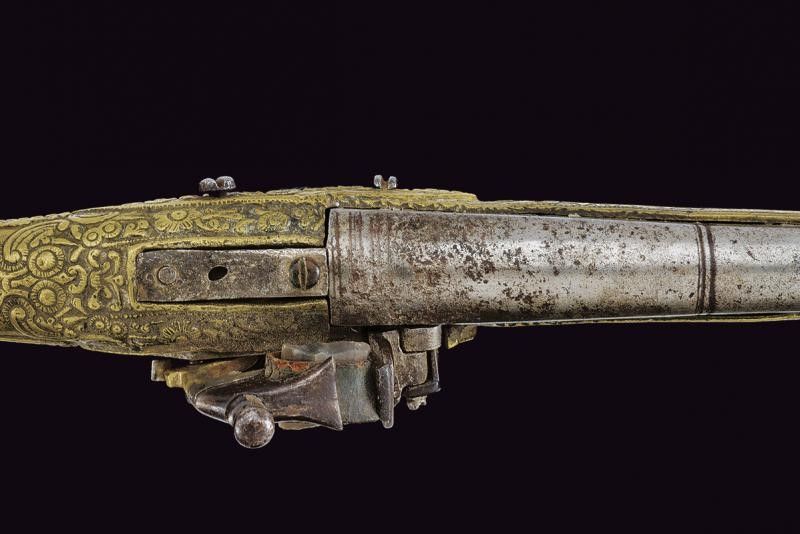 Balcani, lunghezza 52 cm. Secondo quarto del XIX Secolo Canna tonda, liscia con base quadra. Batteria alla micheletta, parti del cane di restauro. La cassa e il reggicanna in ottone riccamente decorato a motivi floreali in bassorilievo. Meccanica da rivedere. Questo lotto è importato da un Paese extra UE e comporta una tassazione aggiuntiva rispetto alla commissione della casa d'aste e alla tassa sul servizio. Di conseguenza, la commissione totale, comprensiva di tutte le tasse, ammonta al 35%.