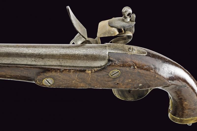Europa, lunghezza 39.5 cm. Canna tonda, liscia, cal. 17 mm. Batteria a pietra focaia con resti di un punzone. Cassa intera in legno con fornimenti in ottone e anello di sospensione in ferro. Questo lotto è importato da un Paese extra UE e comporta una tassazione aggiuntiva rispetto alla commissione della casa d'aste e alla tassa sul servizio. Di conseguenza, la commissione totale, comprensiva di tutte le tasse, ammonta al 35%.