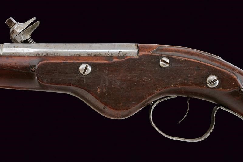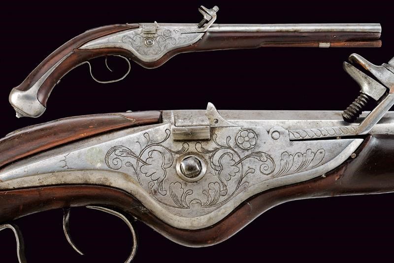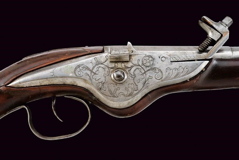 Germania del Nord, lunghezza 54 cm. 1630 - 1640 circa Canna liscia a tre ordini, la prima parte ottagonale con due punzoni sul lato sinistro, dopo un breve segmento a sedici facce, tonda in calibro 13 mm. Batteria a ruota interna, cartella incisa a motivi floreali e con alti bordi obliqui; copriscodellino scorrevole. Cassa intera in legno con fornimenti in ferro. Bacchetta in legno. Questo lotto è importato da un Paese extra UE e comporta una tassazione aggiuntiva rispetto alla commissione della casa d'aste e alla tassa sul servizio. Di conseguenza, la commissione totale, comprensiva di tutte le tasse, ammonta al 35%.