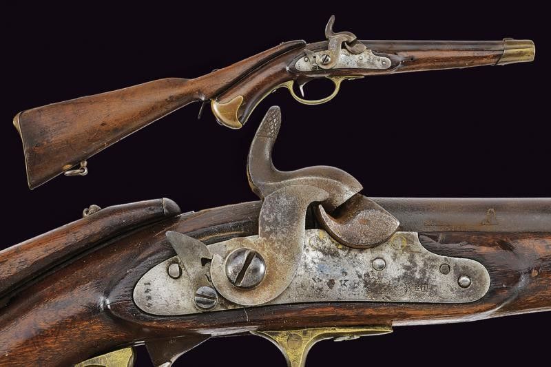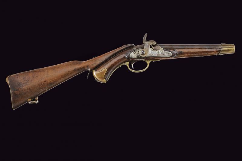 Inghilterra, lunghezza total 67.5 cm. Canna liscia tonda con punzoni del banco di prova di Londra, cal. 15 mm; codetta con alzo. Batteria ridotta a luminello marcata 'K' sotto corona, '1454' e con un'altro punzone; sicura. Cassa intera in legno (piccole mancanze) con fornimenti in ottone, reggicanna con mirino. Il dorso con fornimenti in ferro per ospitare il calciolo rimovibile. Rara.