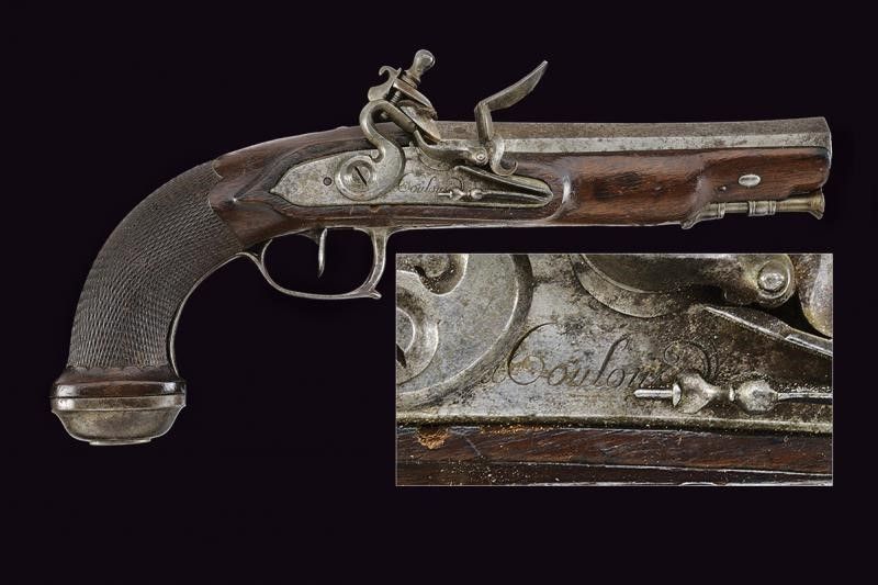 Francia, lunghezza 31 cm. 1800 circa Canna micro-rigata di sezione ottagonale, tre punzoni alla base, volata strombata, mirino mancante; cal. 17 mm. Codetta con alzo. Batteria a pietra focaia firmata 'Couloud'. Cassa intera in legno con calcio zigrinato. Fornimenti e bacchetta in ferro. Questo lotto è importato da un Paese extra UE e comporta una tassazione aggiuntiva rispetto alla commissione della casa d'aste e alla tassa sul servizio. Di conseguenza, la commissione totale, comprensiva di tutte le tasse, ammonta al 35%.