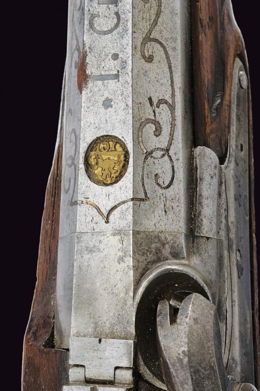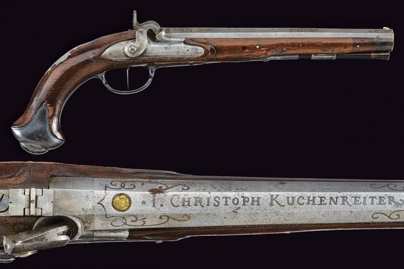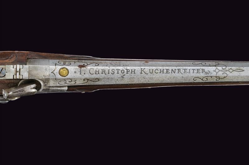 Regensburg, lunghezza 42.5 Seconda metà del XVIII secolo Canna rigata, ottagonale, firmata 'I. CHRISTOPH KUCHENREITER' tra volute in argento e con la sua marca in ottone, mirino, cal. 12 mm; codetta con alzo a tre foglie. Batteria ridotta a luminello. Cassa intera (restauri e piccole mancanze) lievemente scolpita con fornimenti anneriti in ferro. Bacchetta in legno con battipalla in corno. Questo lotto è importato da un Paese extra UE e comporta una tassazione aggiuntiva rispetto alla commissione della casa d'aste e alla tassa sul servizio. Di conseguenza, la commissione totale, comprensiva di tutte le tasse, ammonta al 35%.