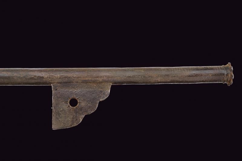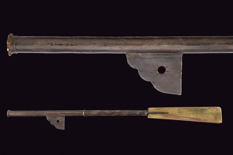 Europa, lunghezza 83 cm. XVI Sec. Canna in ferro a due ordini, la prima parte ottagonale con focone superiore, dopo un anello divine di sezione tonda, volata intagliata a fiore, nella parte inferiore in gancio forato per il fissaggio. La parte posteriore in legno a due rebbi (di tempi moderni). Questo lotto è importato da un Paese extra UE e comporta una tassazione aggiuntiva rispetto alla commissione della casa d'aste e alla tassa sul servizio. Di conseguenza, la commissione totale, comprensiva di tutte le tasse, ammonta al 35%.