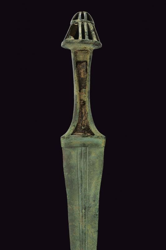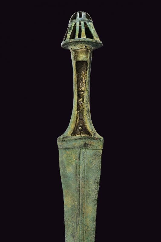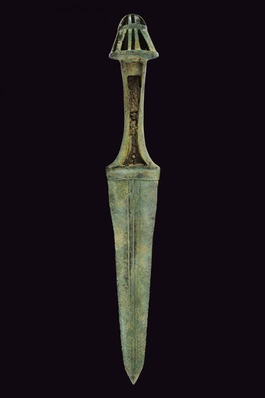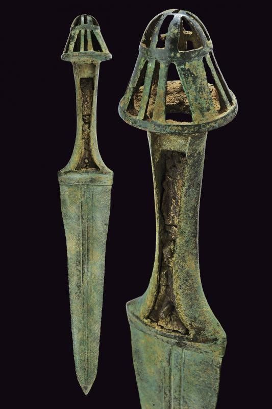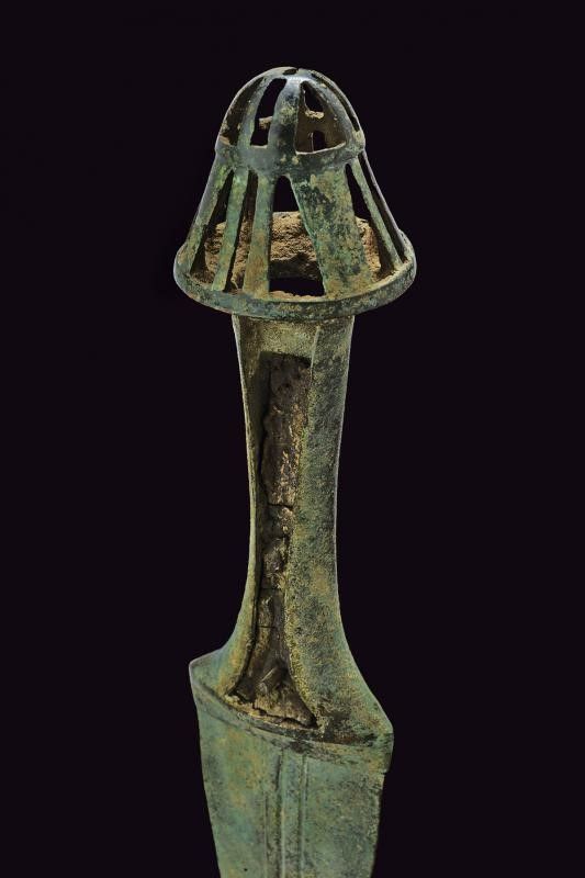 Egitto, lunghezza 28.5 cm. Lama di forma triangolare in bronzo a due fili, duplice nervatura in mezzeria. Impugnatura in bronzo con centro ristretto, conserva ancora resti delle gancetto in legno. Grande pomo a gabbia triangolare (una doga mancante). Raro. Questo lotto è importato da un Paese extra UE e comporta una tassazione aggiuntiva rispetto alla commissione della casa d'aste e alla tassa sul servizio. Di conseguenza, la commissione totale, comprensiva di tutte le tasse, ammonta al 35%.