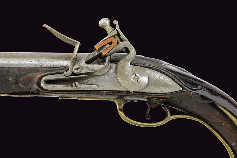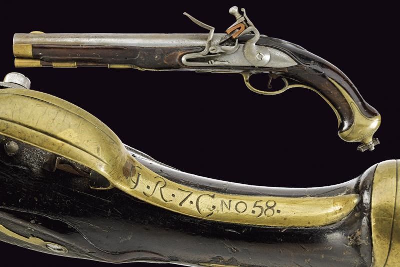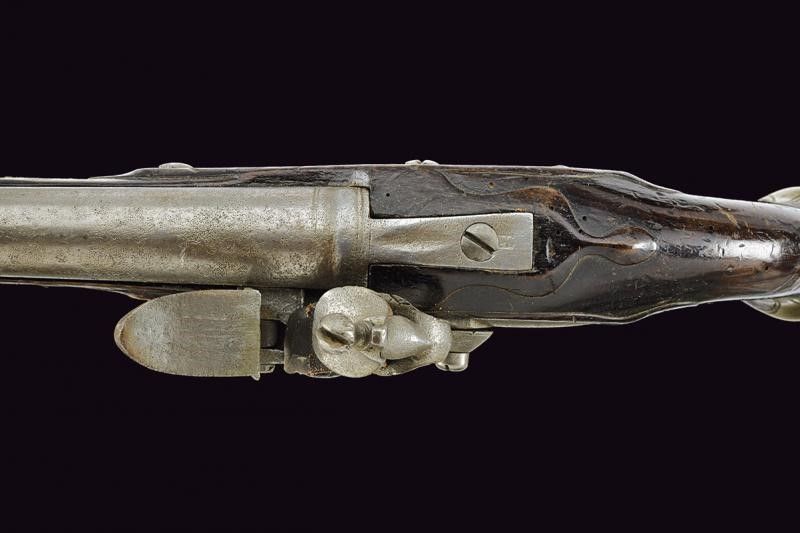 Sassonia, lunghezza 45 cm. Canna liscia tonda con cornice alla base e mirino in ottone, cal. 20 mm. Codetta con traguardo e punzone. Batteria sul lato sinistro a pietra focaia; in mezzo alla molla punzone non del tutto leggibile. Meccanica funzionate. Cassa intera in legno. Segni dell'uso e del tempo, piccoli restauri. Fornimenti in ottone. Ponticello marcato 'G. R. 7. C. N.o 58.'. La coccia con passante. Questo lotto è importato da un Paese extra UE e comporta una tassazione aggiuntiva rispetto alla commissione della casa d'aste e alla tassa sul servizio. Di conseguenza, la commissione totale, comprensiva di tutte le tasse, ammonta al 35%.
