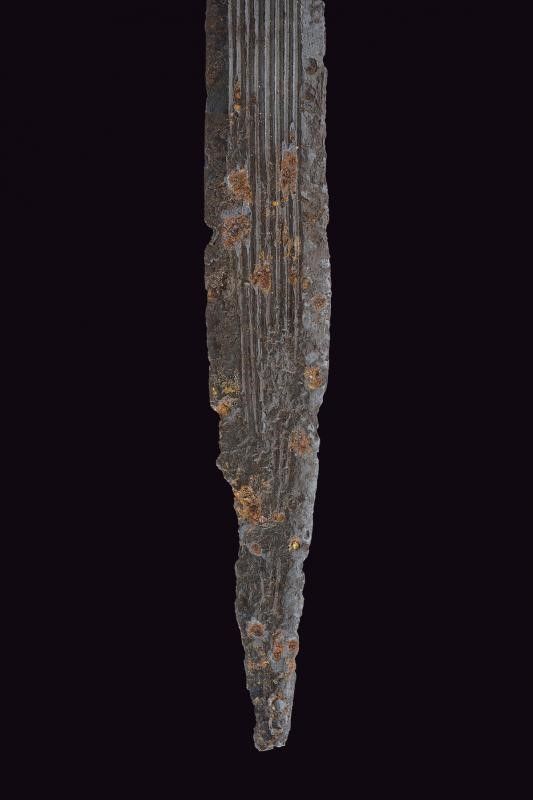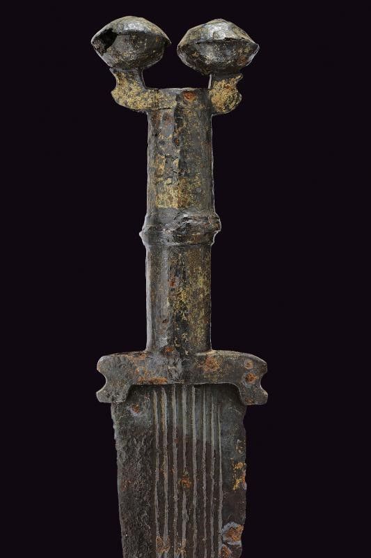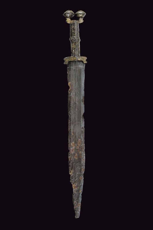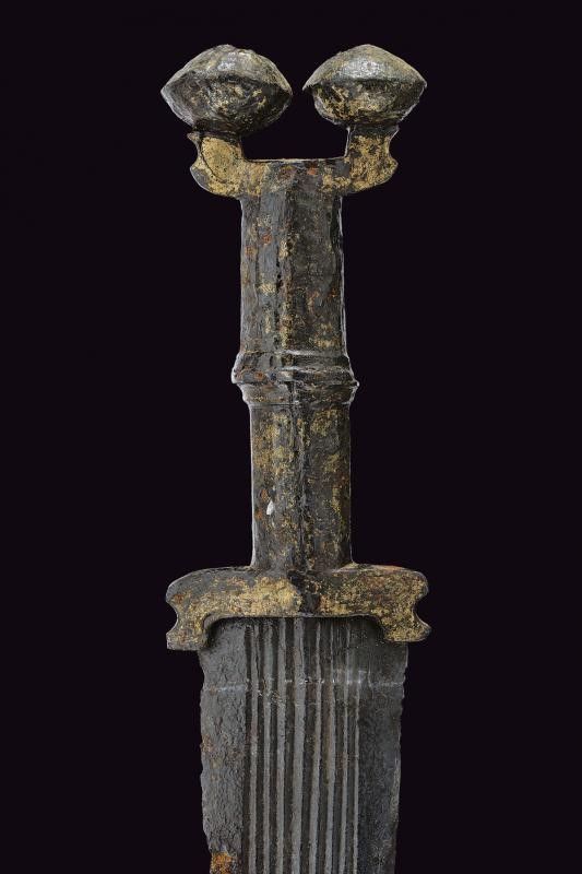 Spagna, lunghezza 45.5 cm. Lama dritta a doppio filo con otto sottili scanalature che si rastremano insieme verso la punta. Impugnatura in ferro fuso in tre pezzi comprendente una piccola guardia che racchiude la base della lama con parte inferiore dell'impugnatura cilindrica faccetta; l'estremità del pomo con due sporgenze appiattite dotate di cappucci separati in fusione cava di sezione ovoidale appiattita. La lama mostra patina scura con danni da ruggine, l'impugnatura conserva tracce di doratura. Questo lotto è importato da un Paese extra UE e comporta una tassazione aggiuntiva rispetto alla commissione della casa d'aste e alla tassa sul servizio. Di conseguenza, la commissione totale, comprensiva di tutte le tasse, ammonta al 35%.