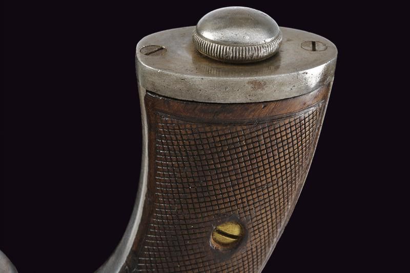 Francia, lunghezza 36.5 cm. 1855 circa Canna rigata (anima pulita, rigatura visibile), ottagonale, con mirino; sul fianco marcatura 'DEVISME B.TE', cal. 10 mm. Tamburo liscio a sei colpi con punzone del banco di prova di Liegi. Meccanica funzionante. Leva d'apertura sul fianco sinistro. Castello liscio. Cane esterno con percussore interno. Guancette in legno con zigrinature (segni d'uso). Coccia con bacchetta avvitata. Questo lotto è importato da un Paese extra UE e comporta una tassazione aggiuntiva rispetto alla commissione della casa d'aste e alla tassa sul servizio. Di conseguenza, la commissione totale, comprensiva di tutte le tasse, ammonta al 35%.