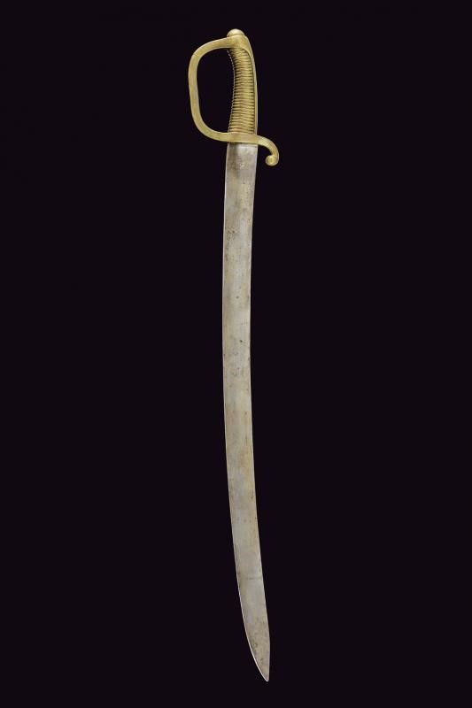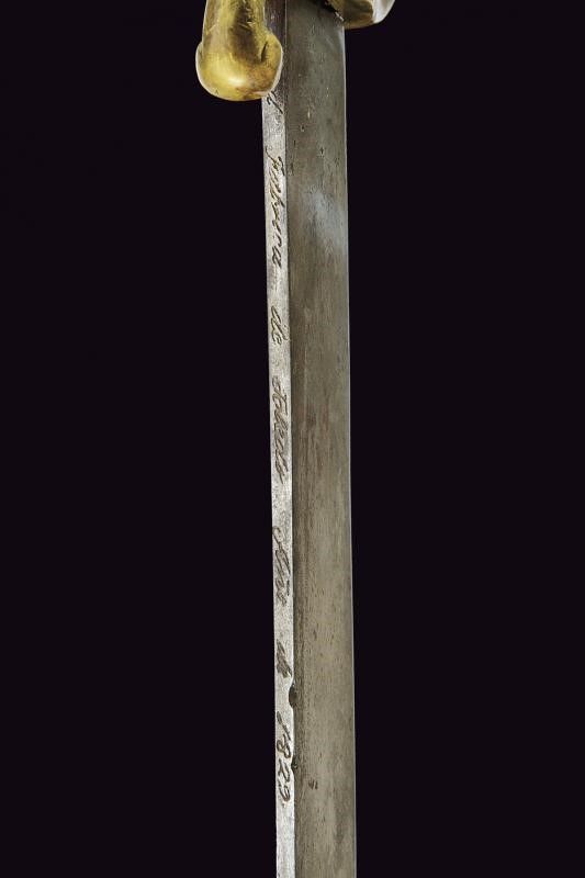 Toledo, lunghezza 82.5 cm. Lama curva, piatta, a un filo con dorso marcato 'Real Fabrica de Toledo Ano de 1829'. Fornimento in ottone massiccio. Questo lotto è importato da un Paese extra UE e comporta una tassazione aggiuntiva rispetto alla commissione della casa d'aste e alla tassa sul servizio. Di conseguenza, la commissione totale, comprensiva di tutte le tasse, ammonta al 35%.