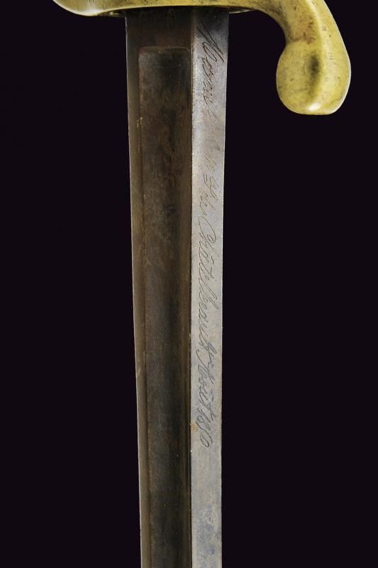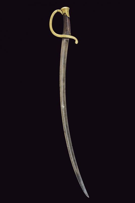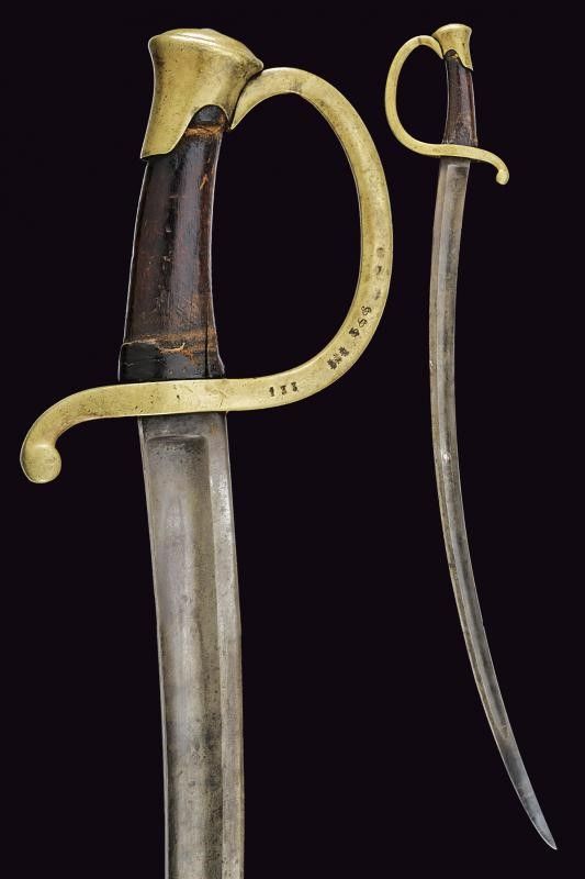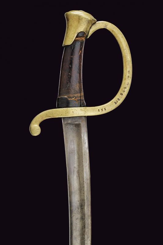 Francia, lunghezza 94.5 cm. Lama curva a un filo e controfilo con ampio sguscio, il tallone con punzoni. Fornimento monoelso in ottone con cappetta corta liscia. Vari punzoni e numeri. Impugnatura in legno con pochi resti di rivestimento. Questo lotto è importato da un Paese extra UE e comporta una tassazione aggiuntiva rispetto alla commissione della casa d'aste e alla tassa sul servizio. Di conseguenza, la commissione totale, comprensiva di tutte le tasse, ammonta al 35%.