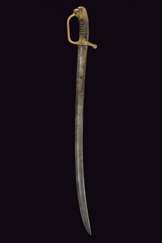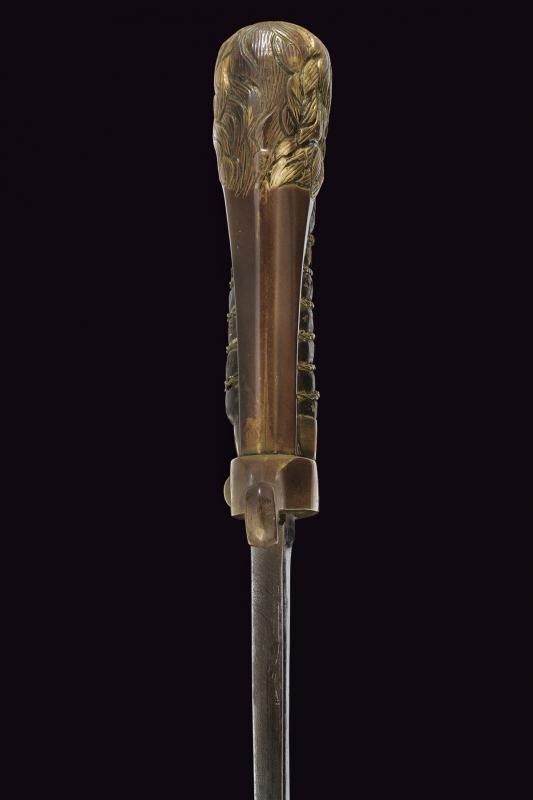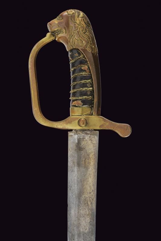 Danimarca, lunghezza 93.5 cm. Lama curva a un filo con ampio sguscio, punzone alla base; tallone. Fornimento in bronzo con resti di doratura, ramo di guardia, punzone sul braccio dell'elso con il marchio di un armaiolo danese, un martello e un mazzafrusto incrociati; grande pomo a testa di leone. Impugnatura in legno rivestita in cuoio con trecciola metallica. Rara. Questo lotto è importato da un Paese extra UE e comporta una tassazione aggiuntiva rispetto alla commissione della casa d'aste e alla tassa sul servizio. Di conseguenza, la commissione totale, comprensiva di tutte le tasse, ammonta al 35%.