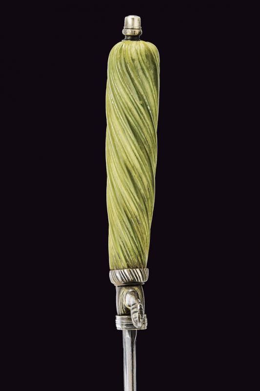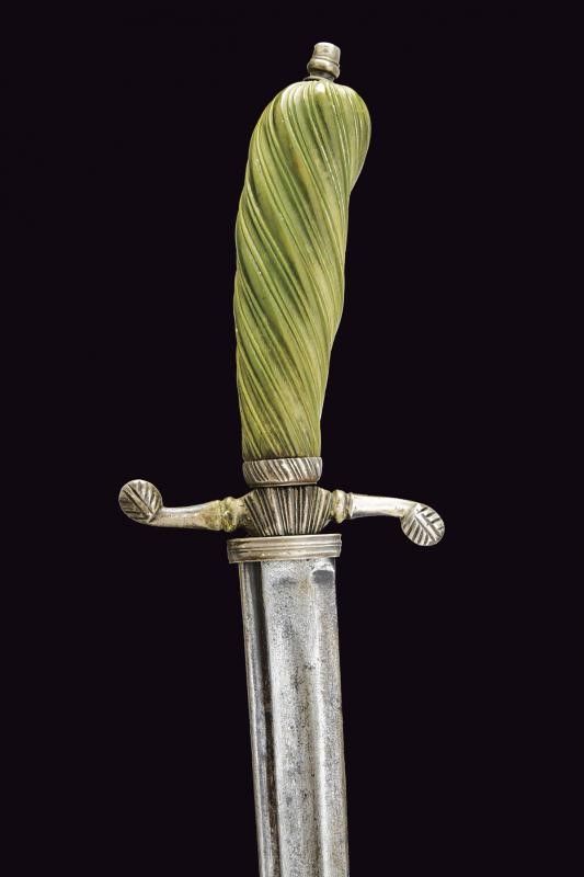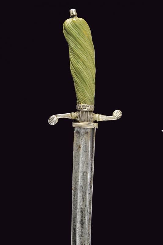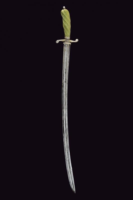 Germania, lunghezza 73.5 cm. fine del XVIII Sec. Lama curva a un filo e controfilo con sgusciatura centrale e scanalatura dorsale. Impugnatura in corno di cervo scolpito a scanalature oblique dipinto di verde con fornimento in argento decorato en suite. Il bottone a forma di ghianda. Questo lotto è importato da un Paese extra UE e comporta una tassazione aggiuntiva rispetto alla commissione della casa d'aste e alla tassa sul servizio. Di conseguenza, la commissione totale, comprensiva di tutte le tasse, ammonta al 35%.