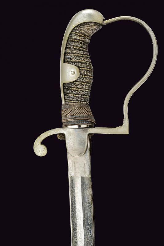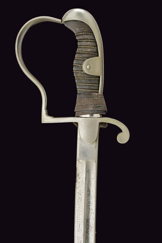 Germania, lunghezza 92 cm. Lama curva a un filo e controfilo, sguscio; incisa con aquila e recante il motto 'MIT GOTT FÜR KAISER UND REICH', aquila con corona imperiale, testa di Guglielmo II, trofei e motivi floreali. Fornimento monoelso in metallo bianco con alette fermafodero. Dragona da ufficiale bavarese. Fodero in ferro ad una campanella. Questo lotto è importato da un Paese extra UE e comporta una tassazione aggiuntiva rispetto alla commissione della casa d'aste e alla tassa sul servizio. Di conseguenza, la commissione totale, comprensiva di tutte le tasse, ammonta al 35%.