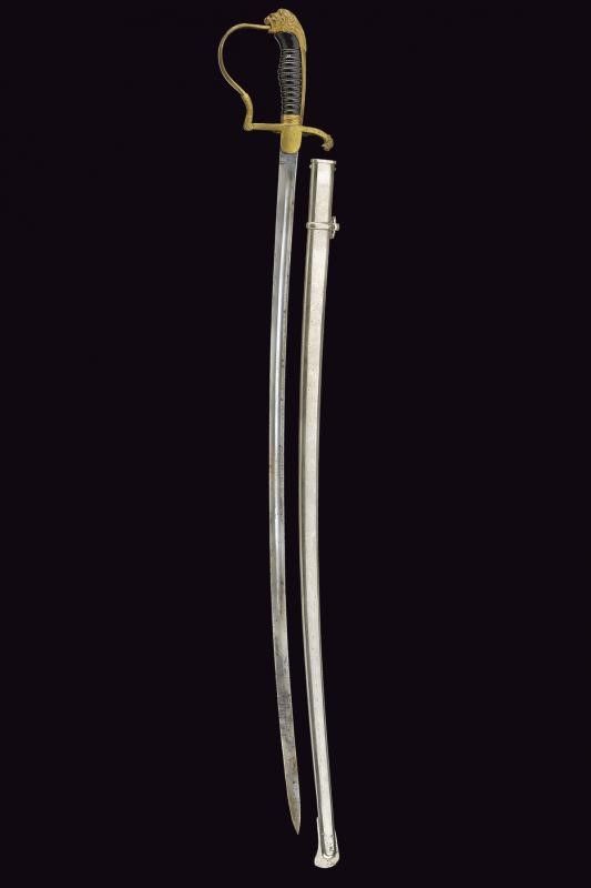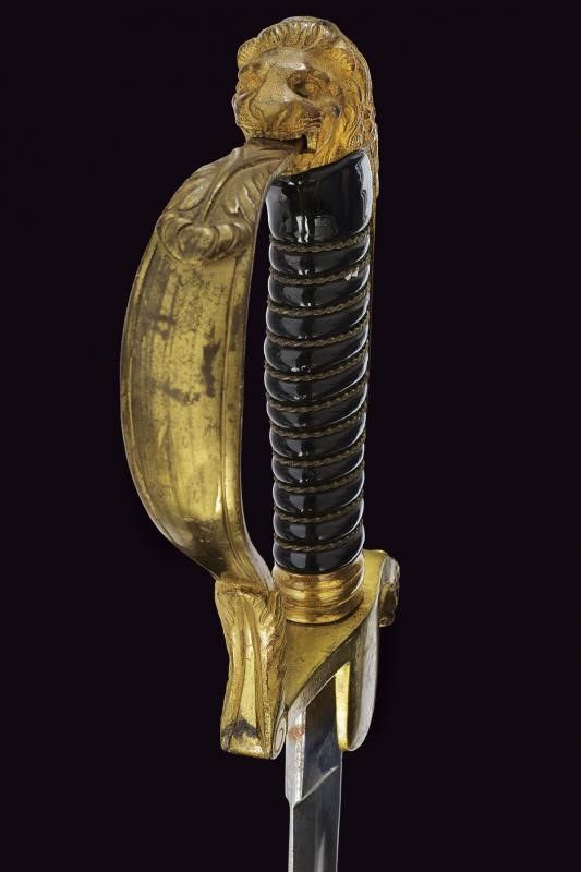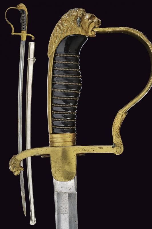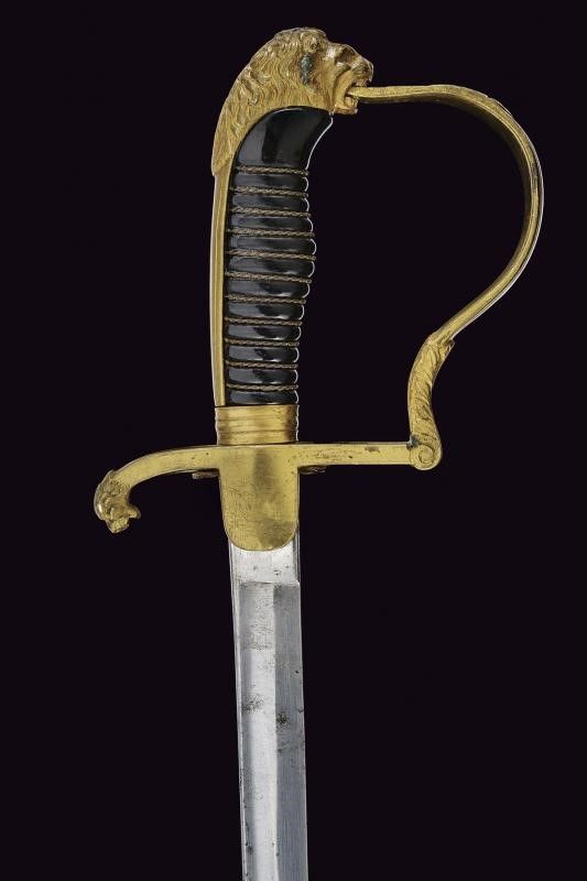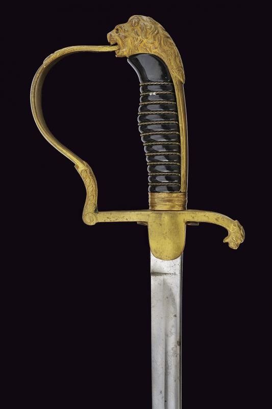 Olanda, lunghezza 103 cm. Lama curva a un filo e controfilo con sguscio, marcata 'YZERHOUWER' in cartiglio; tallone. Fornimento in ottone con alette fermafodero, braccio di parata a testa di leone. Pomo a testa di leone. Impugnatura a spire con trecciola metallica. Fodero in ferro con un anello. Questo lotto è importato da un Paese extra UE e comporta una tassazione aggiuntiva rispetto alla commissione della casa d'aste e alla tassa sul servizio. Di conseguenza, la commissione totale, comprensiva di tutte le tasse, ammonta al 35%.