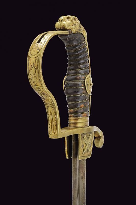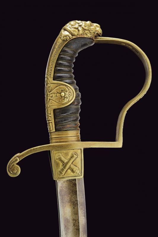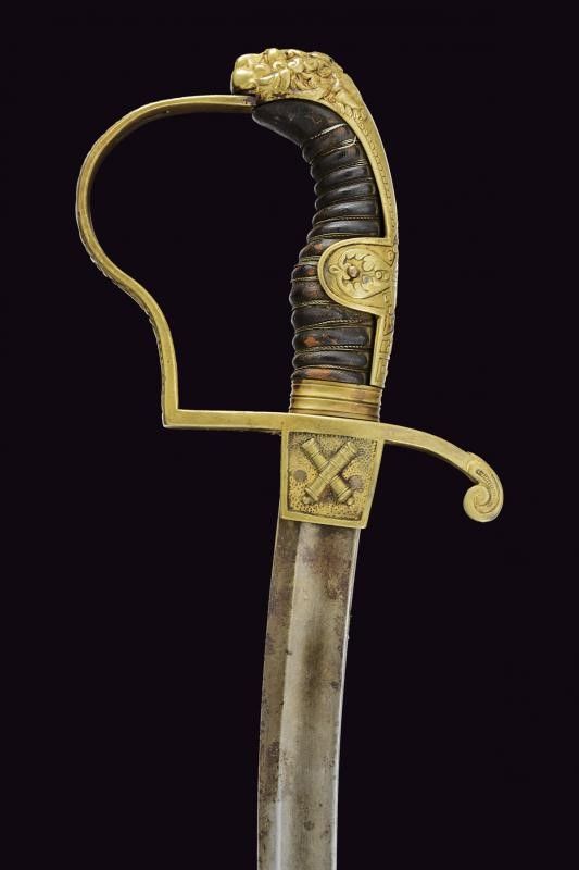 Europa, lunghezza 82.5 cm. Lama curva a un filo e controfilo con ampio sguscio, tallone. Fornimento monoelso in ottone, le alette fermafodero con cannoni incrociati. Pomo a testa di leone, ramo di guardia con trofei e motivi floreali, come anche la lunga cappetta. Impugnatura in legno rivestita di cuoio avvolto con trecciola metallica (segni d'uso e del tempo). Fodero in ferro con due anelli di sospensione su fasce in ottone. Questo lotto è importato da un Paese extra UE e comporta una tassazione aggiuntiva rispetto alla commissione della casa d'aste e alla tassa sul servizio. Di conseguenza, la commissione totale, comprensiva di tutte le tasse, ammonta al 35%.