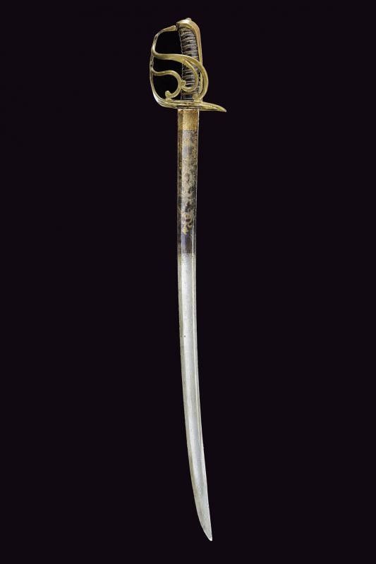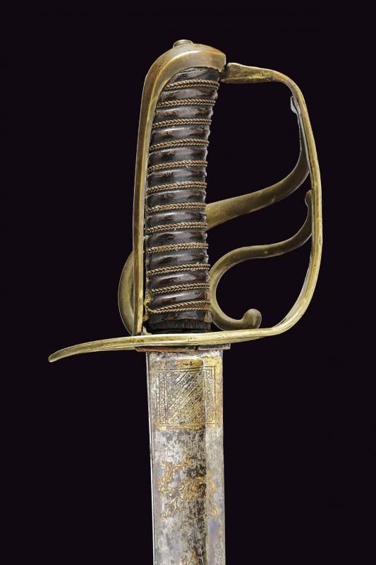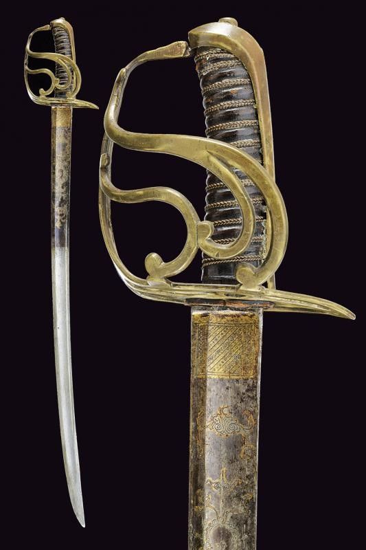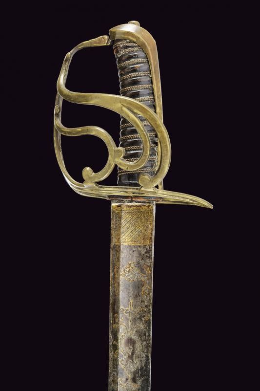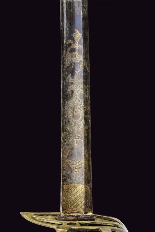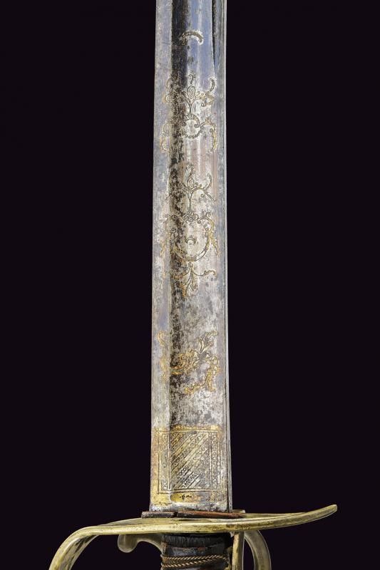 Francia, lunghezza 86 cm. Larga lama leggermente curva a un filo e breve controfilo, ampio sguscio centrale e scanalatura dorsale. La prima parte incisa e dorata su resti di fondo blu a motivi floreali e geometrici. Fornimento in ottone a quattro rami di guardia, coccia traforata e appuntita. Cappetta lunga e faccettata. Impugnatura in legno rivestita di cuoio e con trecciola metallica. Questo lotto è importato da un Paese extra UE e comporta una tassazione aggiuntiva rispetto alla commissione della casa d'aste e alla tassa sul servizio. Di conseguenza, la commissione totale, comprensiva di tutte le tasse, ammonta al 35%.