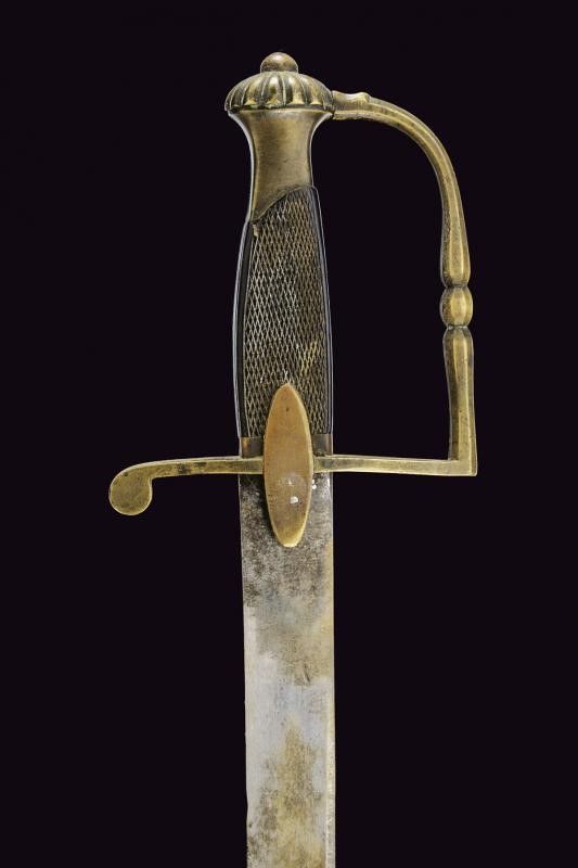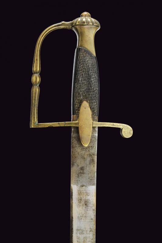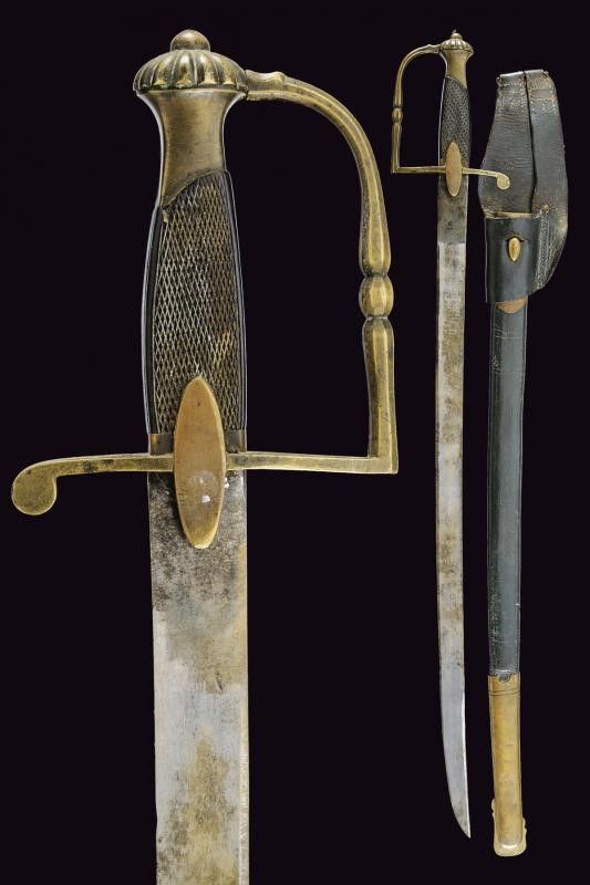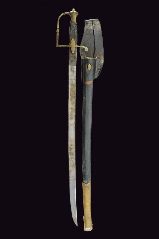 Regno di Sardegna, lunghezza 81 cm. Lama piatta, curva a un filo e breve controfilo; tallone. Fornimento in ottone con alette fermafodero, impugnatura zigrinata in ebano, cappetta corta. Fodero in cuoio antico con leggeri segni d'uso, puntale e cappa in ottone. Conserva la taschetta. Questo lotto è importato da un Paese extra UE e comporta una tassazione aggiuntiva rispetto alla commissione della casa d'aste e alla tassa sul servizio. Di conseguenza, la commissione totale, comprensiva di tutte le tasse, ammonta al 35%.