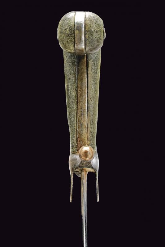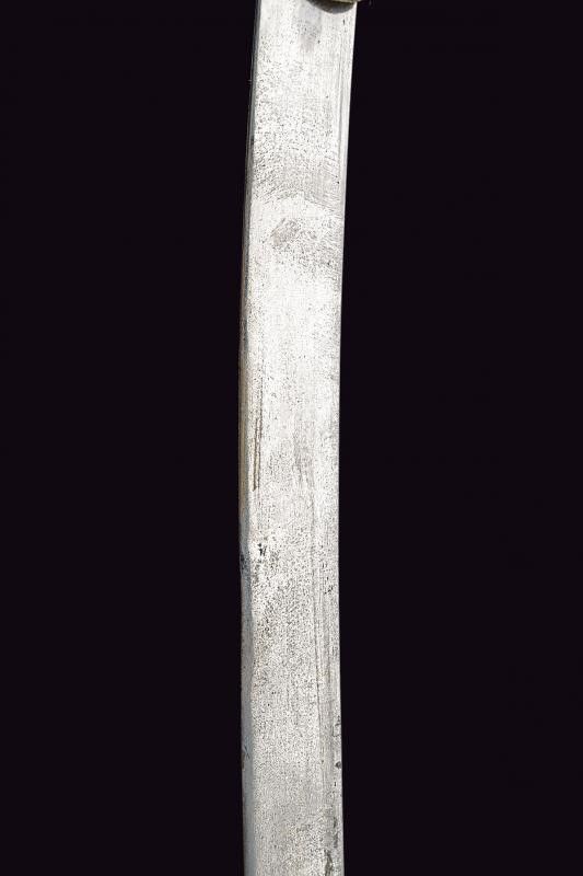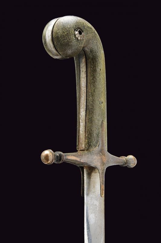 Turchia, lunghezza 93 cm. XIX Secolo Lama piatta, curva, a un filo. Fornimento a croce in ferro decorato in rame con resti di incisioni; gancetti in legno con pomo angolato. Fodero in legno rivestito in cuoio (piccole mancanze) e cucito in filo metallico; fornimenti in ferro decorati en suite con l'elso, due anelli di sospensione. Questo lotto è importato da un Paese extra UE e comporta una tassazione aggiuntiva rispetto alla commissione della casa d'aste e alla tassa sul servizio. Di conseguenza, la commissione totale, comprensiva di tutte le tasse, ammonta al 35%.