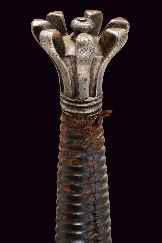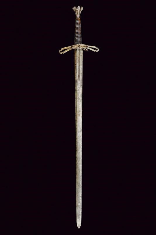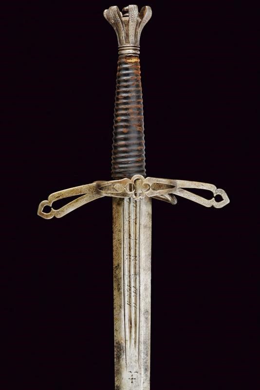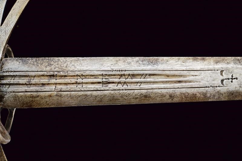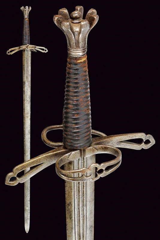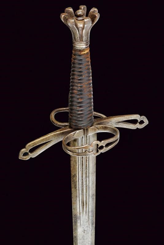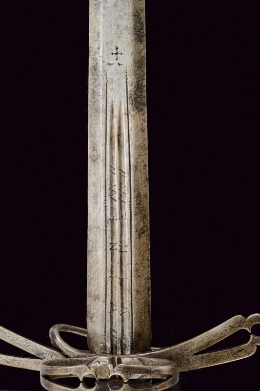 Larga lama dritta a due fili con sezione trasversale esagonale, doppia sgusciatura alla base su entrambi i lati, la scritta 'VINEM' nelle sgusciature. Fornimento in ferro, rami dell'elso piatti, traforati e incurvati verso la alma (gusto spagnolo), anello di parata traforato al centro con un quadrifoglio, anello da pollice con ramo di controguardia; pomo in ferro tagliato a forma di corona. Impugnatura ricoperta in cuoio (piccole mancanze). Questo lotto è importato da un Paese extra UE e comporta una tassazione aggiuntiva rispetto alla commissione della casa d'aste e alla tassa sul servizio. Di conseguenza, la commissione totale, comprensiva di tutte le tasse, ammonta al 35%.