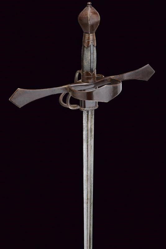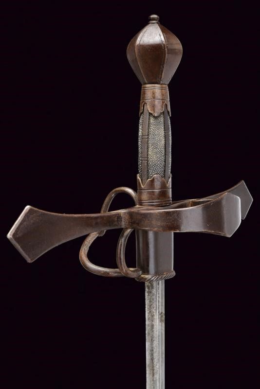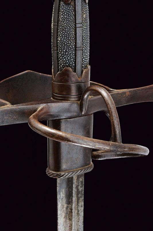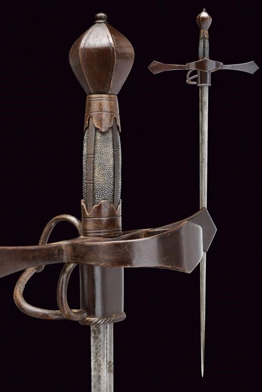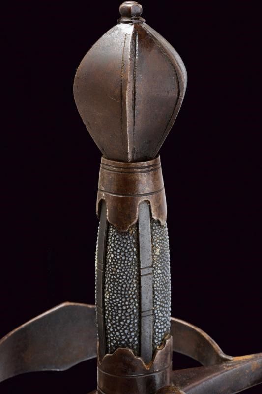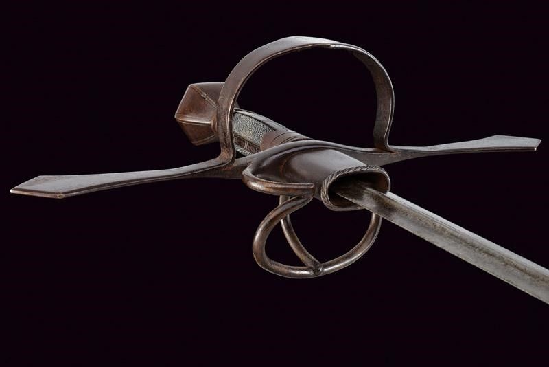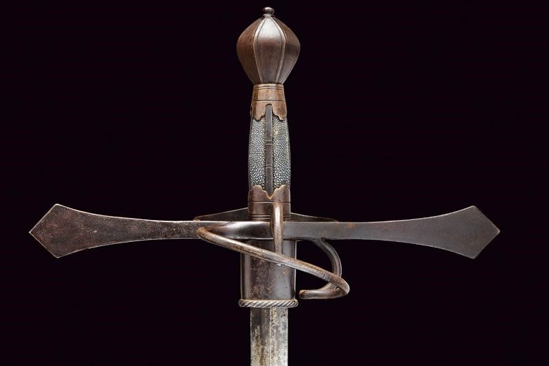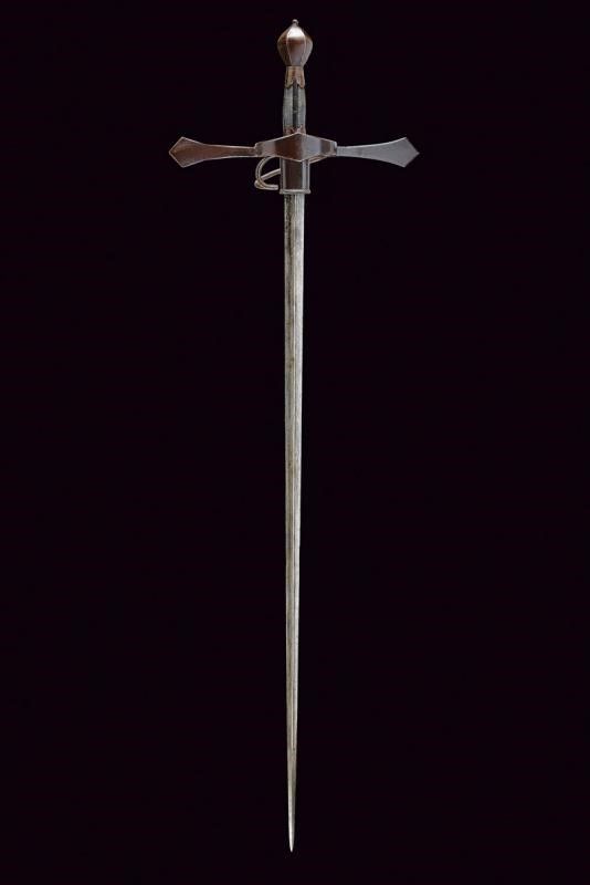 Sassonia, lunghezza 123.5 cm. Lunga lama dritta a due fili con nervatura centrale, la base con fornimento per ospitare il fodero avente bordo lavorato a fingere il tortiglione. Fornimento a croce in ferro con bracci dell'elso piatti ed ingrossati verso l'esterno aventi estremità triangolari; l'anello di parata lavorato en suite. Pomo a sei facce ingrossate al centro e delineato ai bordi. La parte posteriore con ramo di parata e anello da pollice. Impugnatura in legno rivestita con pelle di pesce e con ghiere e doghe fin ferro. Questo lotto è importato da un Paese extra UE e comporta una tassazione aggiuntiva rispetto alla commissione della casa d'aste e alla tassa sul servizio. Di conseguenza, la commissione totale, comprensiva di tutte le tasse, ammonta al 35%.
