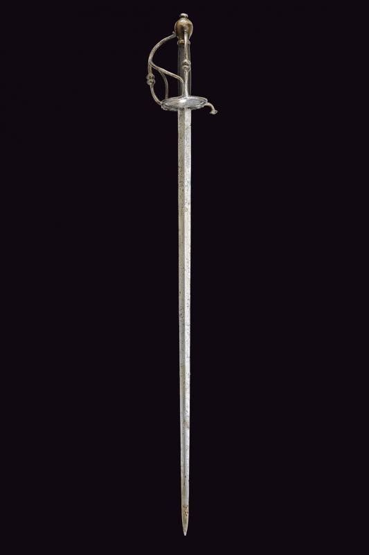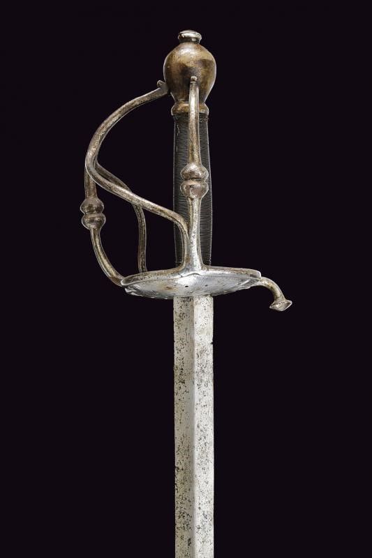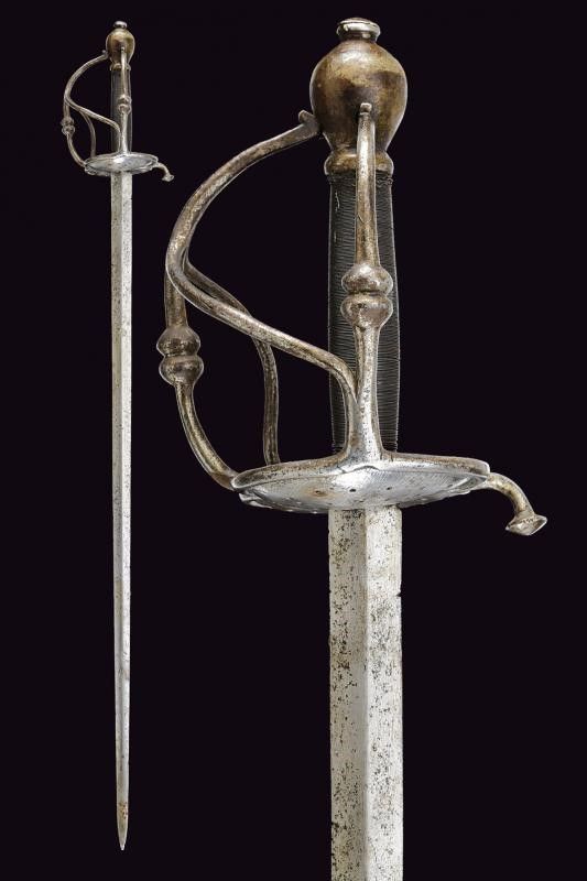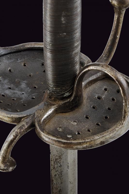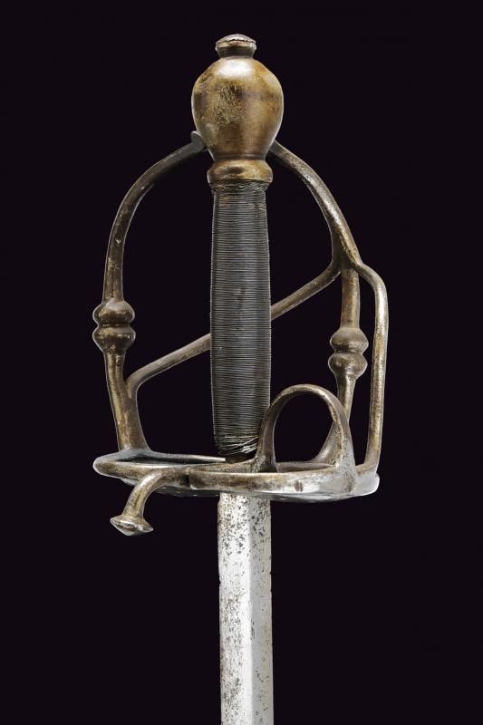 Germania del Nord, lunghezza 98 cm. secondo quarto del XVII Sec. Lama dritta a due fili costolata in mezzeria. Fornimento tipico a doppia valva traforata, rami a gabbia con nodi al centro, anello da pollice. Pomo a vaso. Impugnatura in legno, il rivestimento in fil di ferro di epoca successiva. Questo lotto è importato da un Paese extra UE e comporta una tassazione aggiuntiva rispetto alla commissione della casa d'aste e alla tassa sul servizio. Di conseguenza, la commissione totale, comprensiva di tutte le tasse, ammonta al 35%.