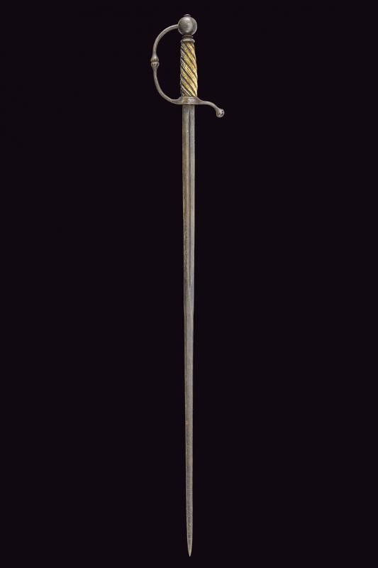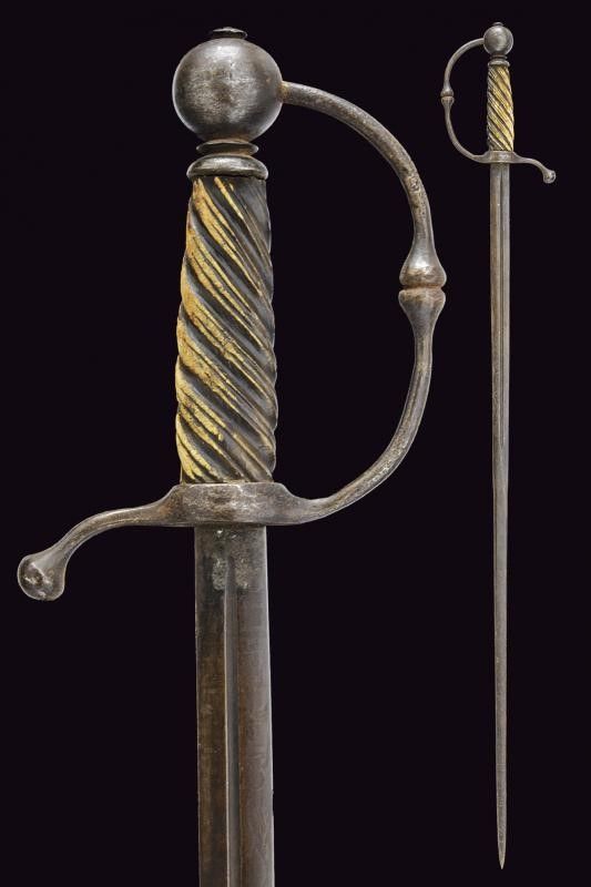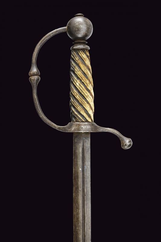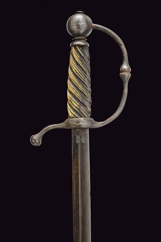 Germania, lunghezza 97 cm. XVII / XIX Secolo Lama dritta della seconda metà del XIX secolo, la prima parte priva di filo, con scanalatura centrale e con resti di incisioni floreali; la seconda parte a due fili e piatta. Fornimento in ferro con braccio di parata e ramo di guardia nello stile delle spade alla vallona, pomo sferico; impugnatura in corno di cervo intagliato a spire. Questo lotto è importato da un Paese extra UE e comporta una tassazione aggiuntiva rispetto alla commissione della casa d'aste e alla tassa sul servizio. Di conseguenza, la commissione totale, comprensiva di tutte le tasse, ammonta al 35%.