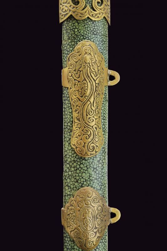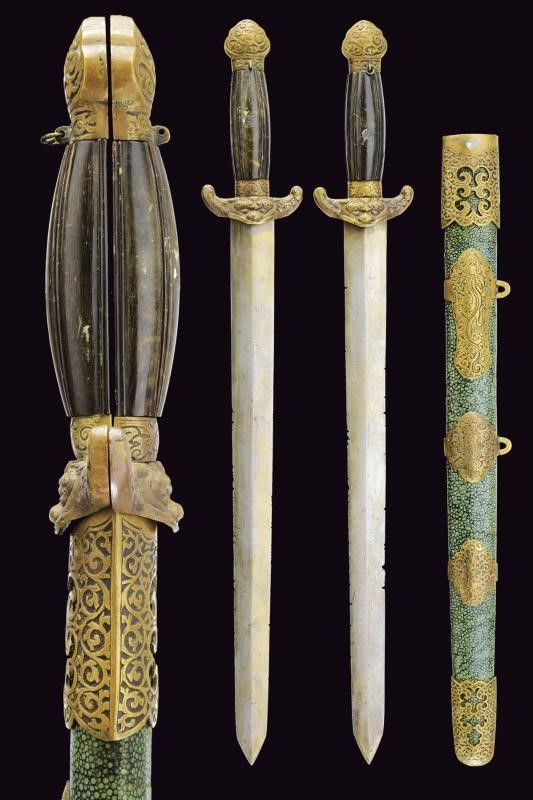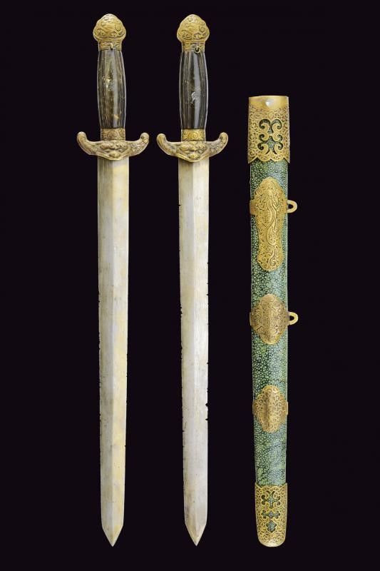 Fine del XIX Secolo Lame a due fili (varie intaccature); fornimenti in ottone massiccio, masselli con testa di drago in rilievo, pomi incisi a motivi floreali ed impugnature in corno marrone decorate a nervature. Insieme in un unico fodero in legno, rivestito con pelle di razza dipinta di verde, dotato di fornimenti in ottone parzialmente traforati ed incisi, quello centrale decorato con un drago, e uno con breve iscrizione in lingua cinese. Due anelli di sospensione. Questo lotto è importato da un Paese extra UE e comporta una tassazione aggiuntiva rispetto alla commissione della casa d'aste e alla tassa sul servizio. Di conseguenza, la commissione totale, comprensiva di tutte le tasse, ammonta al 35%.