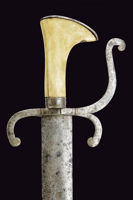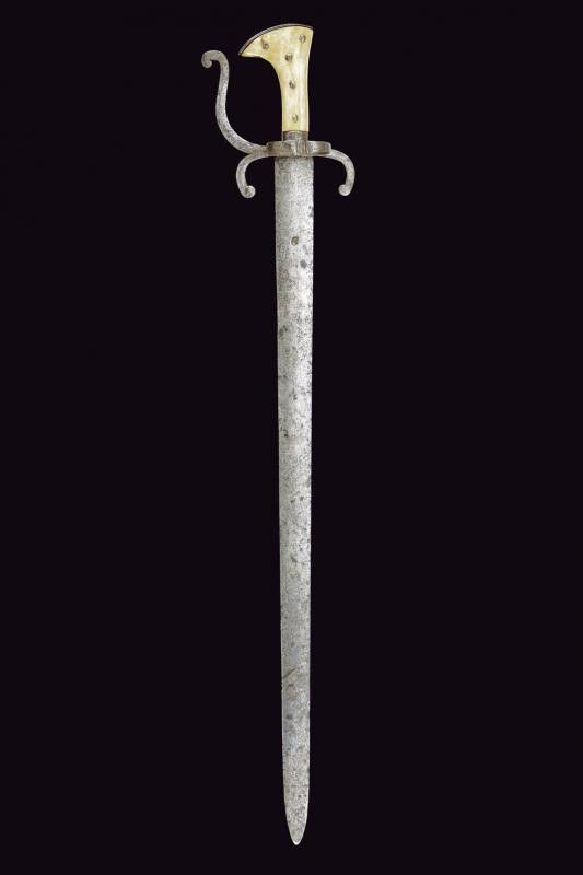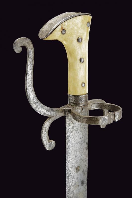 Germania, lunghezza 92.5 cm. Seconda metà del XVII Secolo Larga lama dritta di sezione lenticolare a due fili, marca su entrambi i lati. Fornimento in ferro con bracci dell'elso incrinati verso la lama e come il ramo di guardia, con ricciolo alle estremità, grande anello di parata. Impugnatura in corno di cervo lucidato, cappetta e ghiera in ferro. Questo lotto è importato da un Paese extra UE e comporta una tassazione aggiuntiva rispetto alla commissione della casa d'aste e alla tassa sul servizio. Di conseguenza, la commissione totale, comprensiva di tutte le tasse, ammonta al 35%.